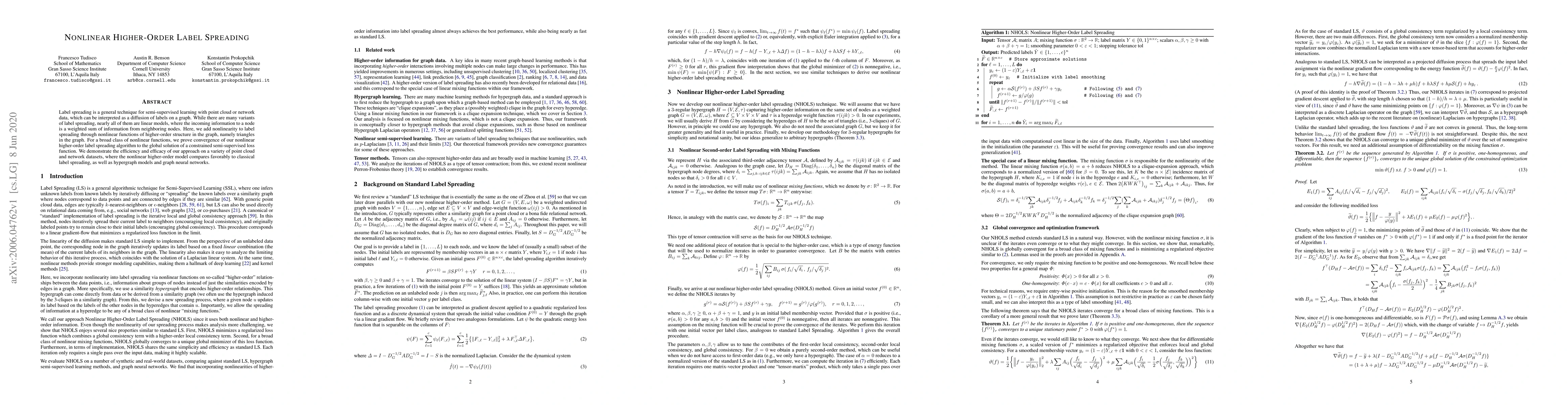 This paper introduces a nonlinear higher-order label spreading algorithm that incorporates triangle-based higher-order graph structures for semi-supervised learning. The authors prove convergence to the global solution and demonstrate superior performance compared to linear label spreading, hypergraph models, and graph neural networks on various datasets.