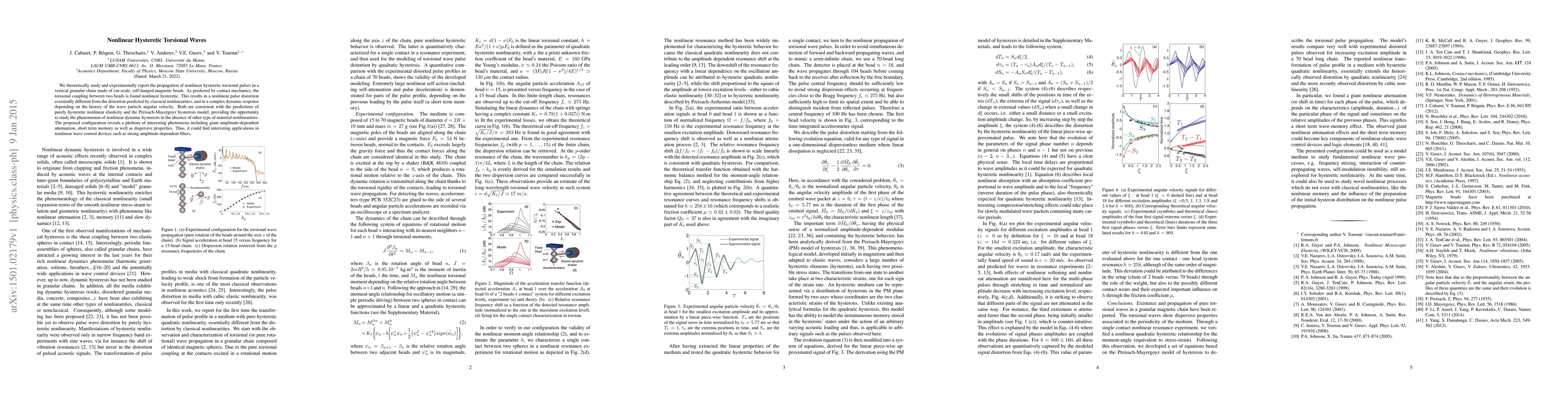 This paper investigates nonlinear hysteretic torsional waves in a vertical granular chain of magnetic beads, revealing complex dynamic responses and pulse distortion due to hysteretic torsional coupling. The study highlights phenomena like giant amplitude-dependent attenuation and dispersive properties, suggesting potential applications in nonlinear wave control devices.