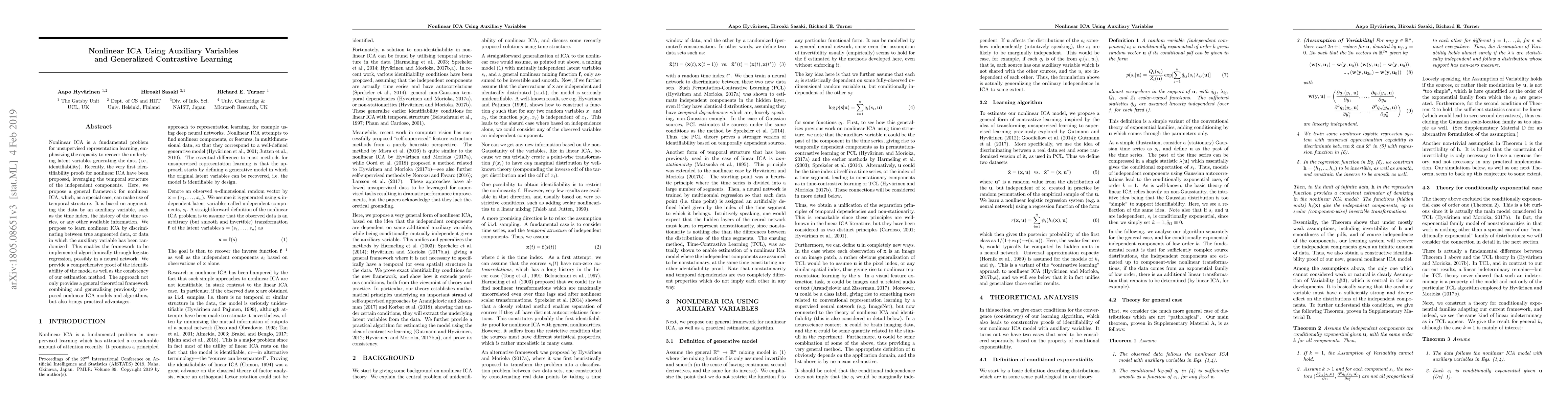 This paper proposes a novel framework for nonlinear independent component analysis (ICA) that utilizes auxiliary variables and generalized contrastive learning. It introduces an approach to learn ICA by distinguishing between true and randomized augmented data, ensuring identifiability and consistency of the estimation method.