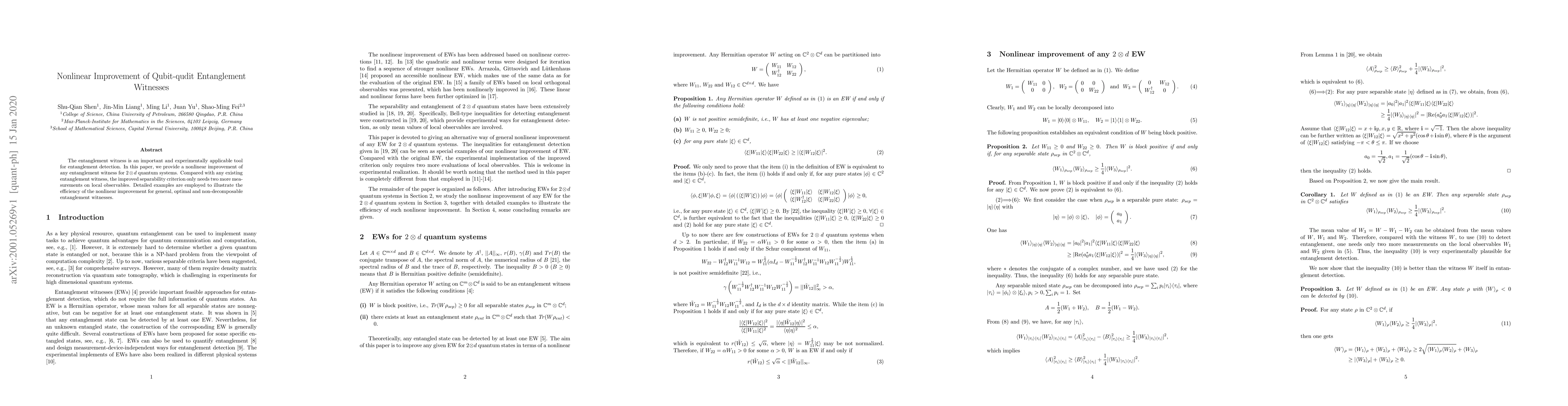 The entanglement witness is an important and experimentally applicable tool for entanglement detection. In this paper, we provide a nonlinear improvement of any entanglement witness for $2\otimes d$ quantum systems. Compared with any existing entanglement witness, the improved separability criterion only needs two more measurements on local observables. Detailed examples are employed to illustrate the efficiency of the nonlinear improvement for general, optimal and non-decomposable entanglement witnesses.