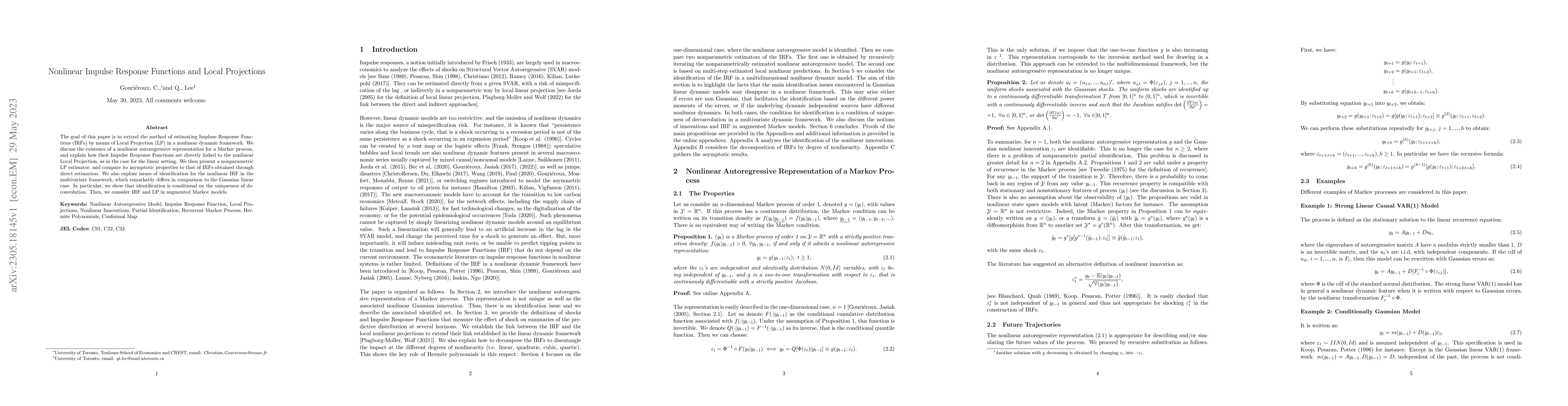 This paper extends the Local Projection method for estimating nonlinear Impulse Response Functions (IRFs) in a dynamic framework, discussing the existence of a nonlinear autoregressive representation and presenting a nonparametric LP estimator. It also explores the identification issues in multivariate nonlinear settings and applies the method to augmented Markov models.