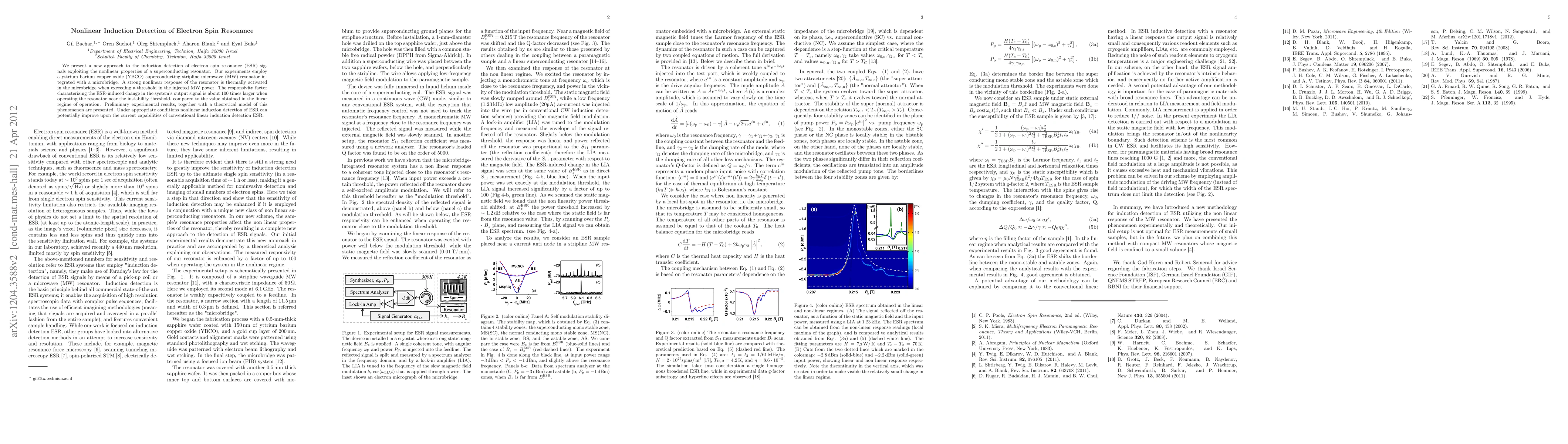 This paper introduces a novel nonlinear induction detection method for electron spin resonance (ESR) using a superconducting resonator, showing a 100-fold increase in responsivity near the instability threshold compared to linear operation. The method employs a YBCO superconducting stripline resonator integrated with a microbridge to achieve enhanced detection capabilities.
