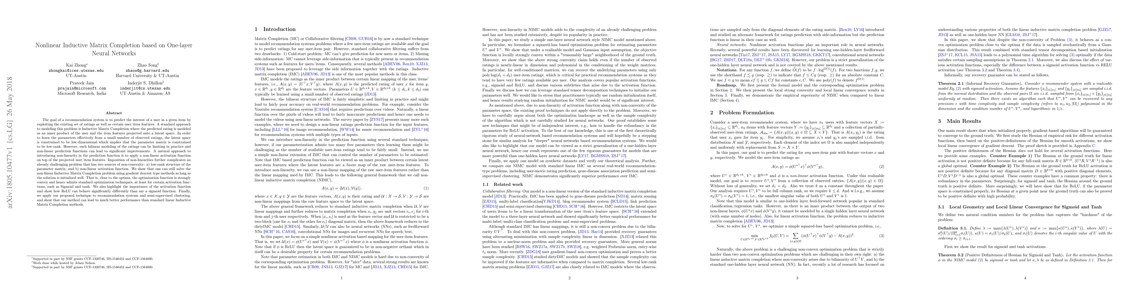 This paper proposes a nonlinear inductive matrix completion method using one-layer neural networks to enhance recommendation systems by incorporating non-linear activation functions. It demonstrates that gradient descent methods can effectively solve the non-convex optimization problem, especially with well-initialized solutions, and shows improved performance over linear methods.