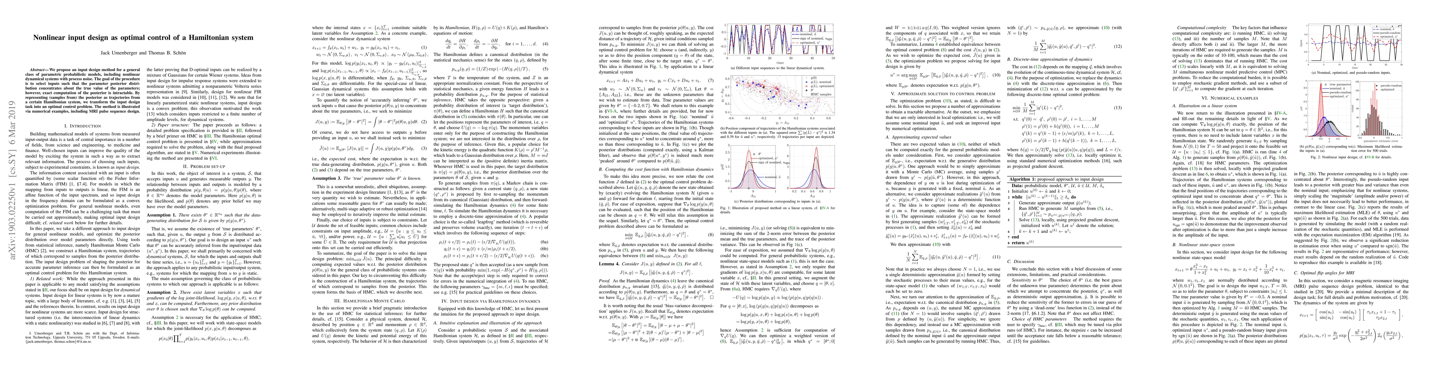 We propose an input design method for a general class of parametric probabilistic models, including nonlinear dynamical systems with process noise. The goal of the procedure is to select inputs such that the parameter posterior distribution concentrates about the true value of the parameters; however, exact computation of the posterior is intractable. By representing (samples from) the posterior as trajectories from a certain Hamiltonian system, we transform the input design task into an optimal control problem. The method is illustrated via numerical examples, including MRI pulse sequence design.