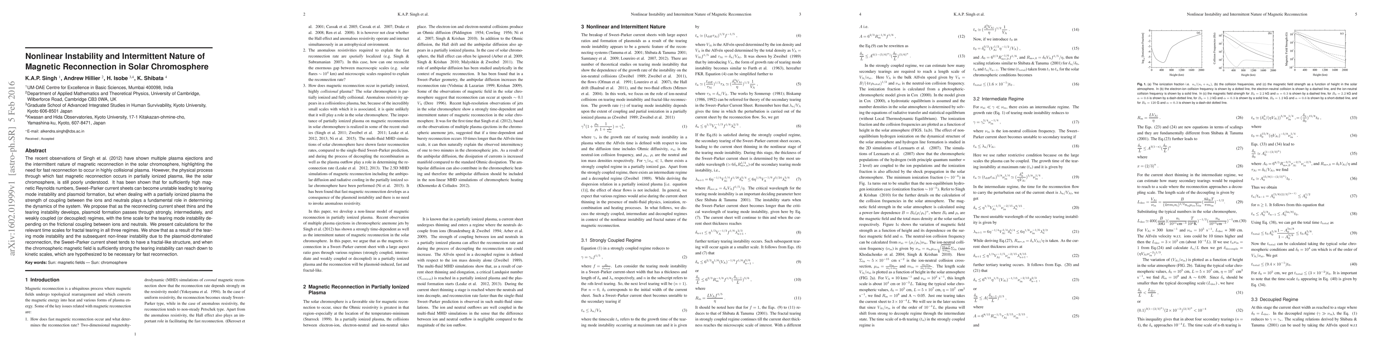 This paper investigates the nonlinear instability and intermittent nature of magnetic reconnection in the solar chromosphere, proposing that tearing mode instability and plasmoid formation occur through strongly, intermediately, and weakly coupled regimes, with time scales dependent on frictional coupling between ions and neutrals. The study concludes that the Sweet-Parker current sheet exhibits fractal-like structures due to non-linear instabilities, and strong chromospheric magnetic fields can drive the tearing instability to kinetic scales, facilitating fast reconnection.