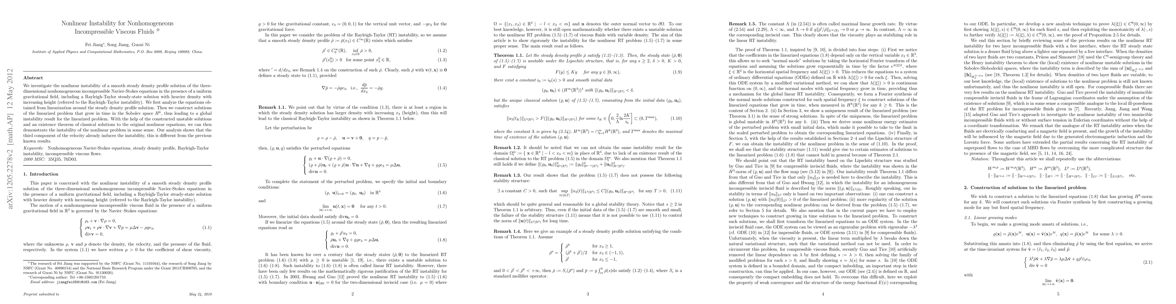We investigate the nonlinear instability of a smooth steady density profile solution of the threedimensional nonhomogeneous incompressible Navier-Stokes equations in the presence of a uniform gravitational field, including a Rayleigh-Taylor steady-state solution with heavier density with increasing height (referred to the Rayleigh-Taylor instability). We first analyze the equations obtained from linearization around the steady density profile solution. Then we construct solutions of the linearized problem that grow in time in the Sobolev space Hk, thus leading to a global instability result for the linearized problem. With the help of the constructed unstable solutions and an existence theorem of classical solutions to the original nonlinear equations, we can then demonstrate the instability of the nonlinear problem in some sense. Our analysis shows that the third component of the velocity already induces the instability, this is different from the previous known results.