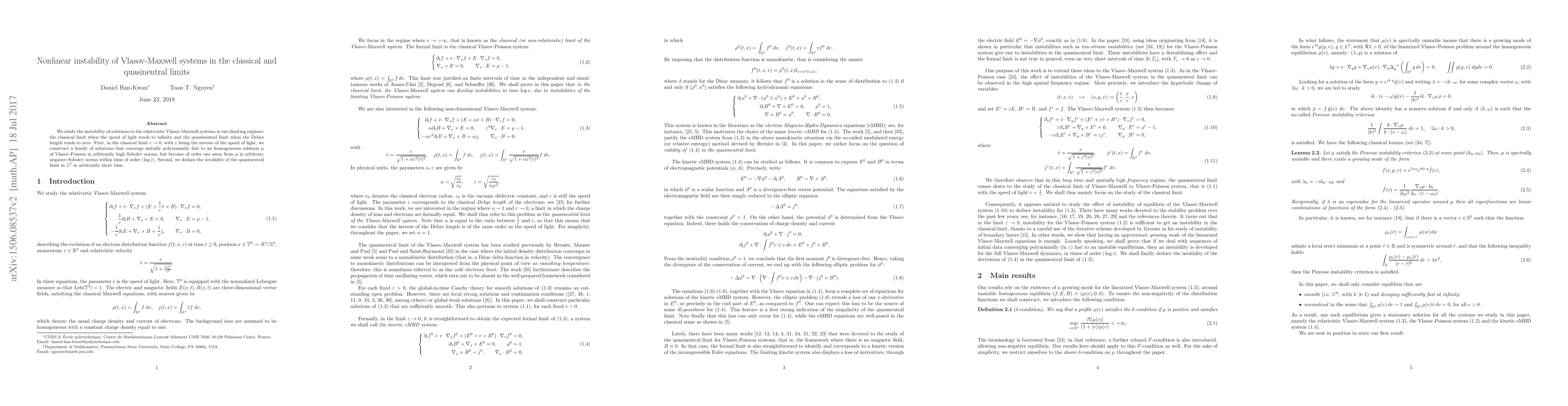 This paper investigates the nonlinear instability of relativistic Vlasov-Maxwell systems in the classical and quasineutral limits, showing that solutions converge polynomially fast to a homogeneous Vlasov-Poisson solution initially but become unstable in negative Sobolev norms within a time proportional to $|\log \varepsilon|$. It also concludes that the quasineutral limit fails in $L^2$ in arbitrarily short time.