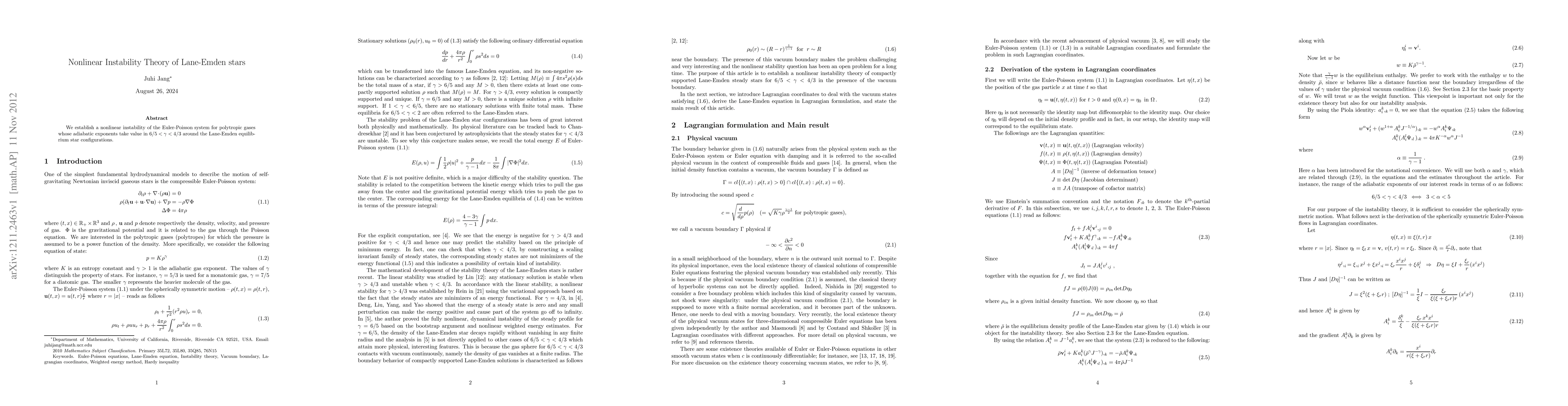 Summary: This paper demonstrates the nonlinear instability of Lane-Emden star configurations for polytropic gases with adiabatic exponents in the range $6/5 < \gamma < 4/3$, using the Euler-Poisson system. The findings reveal significant deviations from equilibrium in these stellar models.