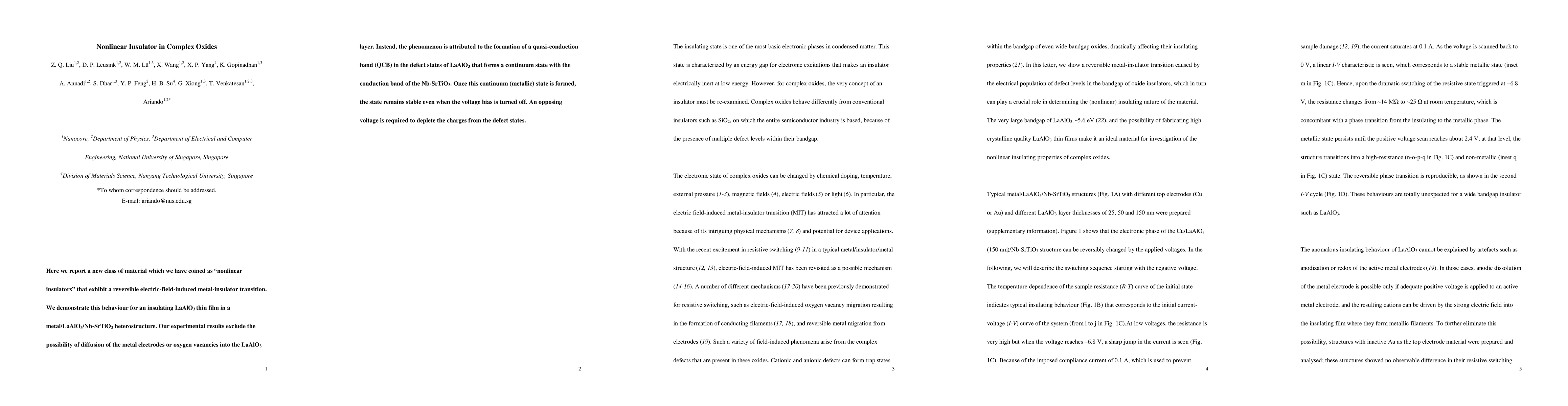 This paper introduces a novel class of nonlinear insulators in complex oxides, exemplified by LaAlO3, which exhibit reversible electric-field-induced metal-insulator transitions. The study demonstrates that these transitions are due to the formation of a quasi-conduction band in the defect states, enabling the creation of stable metallic states that can be controlled by voltage, with potential applications in developing new electronic devices.