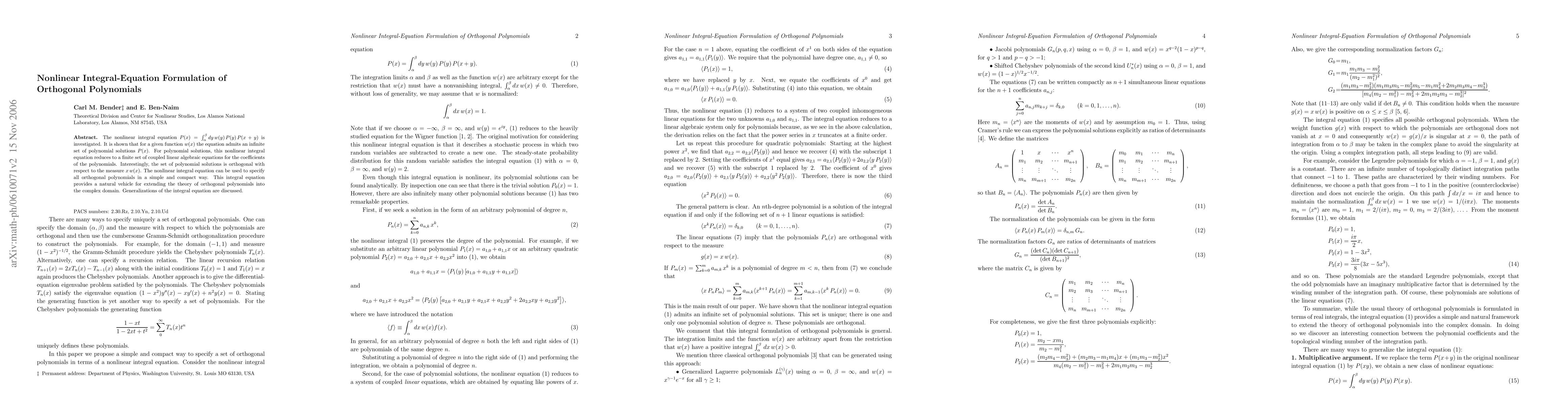 This paper introduces a nonlinear integral equation that can generate an infinite set of orthogonal polynomial solutions, reducing to a finite set of linear equations for polynomial coefficients. It provides a simple method to specify all orthogonal polynomials.
