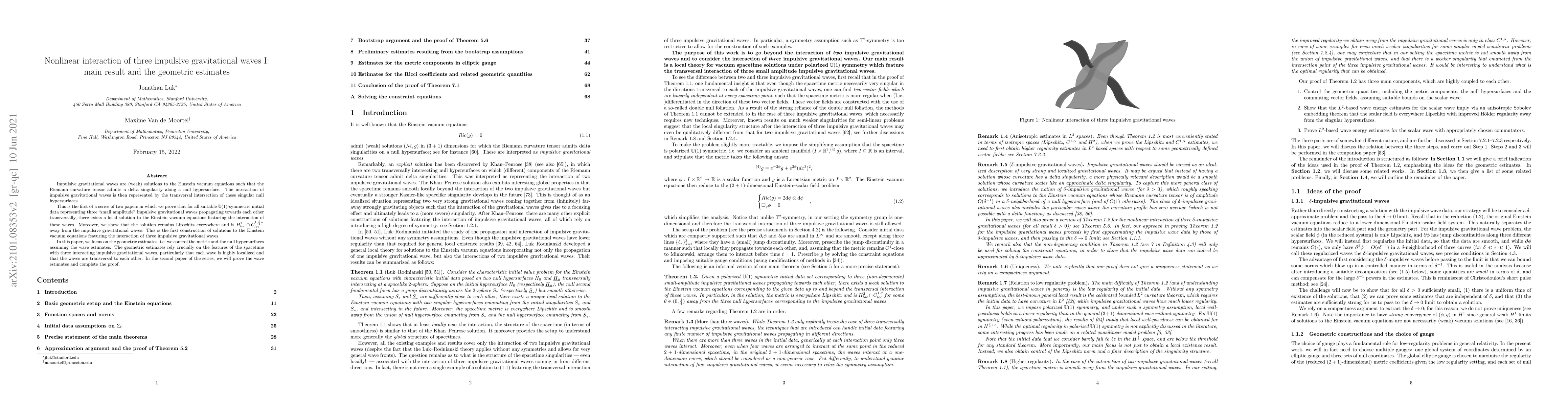 This research paper proves the existence of a local solution to the Einstein vacuum equations for the interaction of three small amplitude impulsive gravitational waves, demonstrating that the solution maintains Lipschitz continuity and specific regularity conditions away from the waves. The focus of this part is on geometric estimates that control the metric and null hypersurfaces, utilizing the localized and transversal nature of the waves.