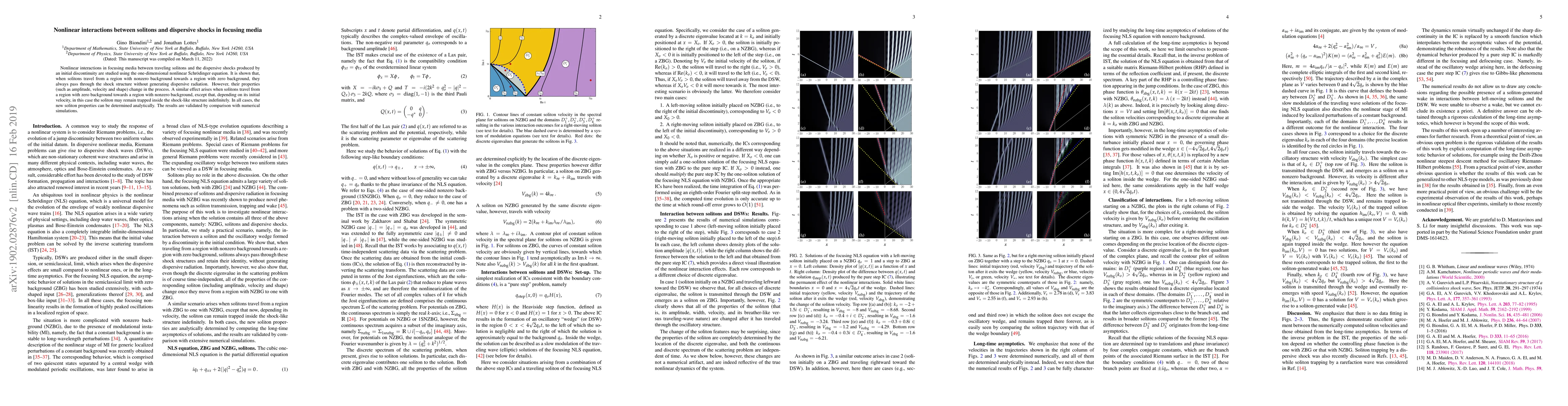 Researchers studied how solitons interact with dispersive shocks in focusing media, finding that they can change properties but not generate radiation when passing through the shock, with some solitons becoming trapped indefinitely.