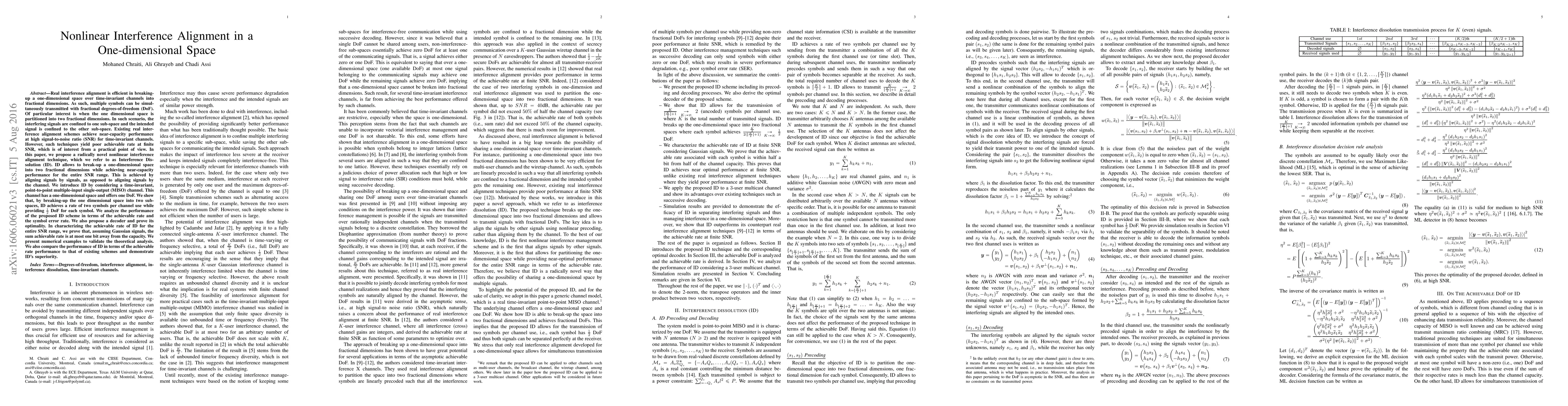 Real interference alignment is efficient in breaking-up a one-dimensional space over time-invariant channels into fractional dimensions. As such, multiple symbols can be simultaneously transmitted with fractional degrees-of-freedom (DoF). Of particular interest is when the one dimensional space is partitioned into two fractional dimensions. In such scenario, the interfering signals are confined to one sub-space and the intended signal is confined to the other sub-space. Existing real interference alignment schemes achieve near-capacity performance at high SNR for time-invariant channels. However, such techniques yield poor achievable rate at finite SNR, which is of interest from a practical point of view. In this paper, we propose a radically novel nonlinear interference alignment technique, which we refer to as Interference Dissolution (ID). ID allows to break-up a one-dimensional space into two fractional dimensions while achieving near-capacity performance for the entire SNR range. This is achieved by aligning signals by signals, as opposed to aligning signals by the channel. We introduce ID by considering a time-invariant MISO channel. This channel has a one-dimensional space and offers one DoF. We show that, by breaking-up the one dimensional space into two sub-spaces, ID achieves a rate of two symbols per channel use while providing $\frac{1}{2}$ DoF for each symbol. We analyze the performance of the proposed ID scheme in terms of the achievable rate and the symbol error rate. In characterizing the achievable rate of ID for the entire SNR range, we prove that, assuming Gaussian signals, the sum achievable rate is at most one bit away from the capacity. We present numerical examples to validate the theoretical analysis. We also compare the performance of ID in terms of the achievable rate performance to that of existing schemes and demonstrate ID's superiority.