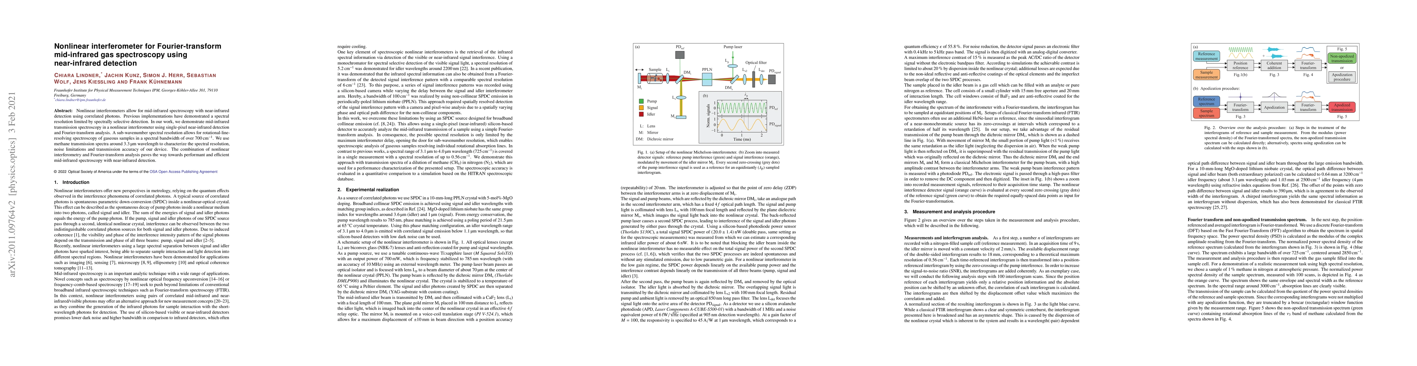 This paper presents a novel nonlinear interferometer for mid-infrared spectroscopy using near-infrared detection, achieving sub-wavenumber spectral resolution through single-pixel detection and Fourier-transform analysis. The method enables high-resolution gas spectroscopy, demonstrated with methane transmission spectra.