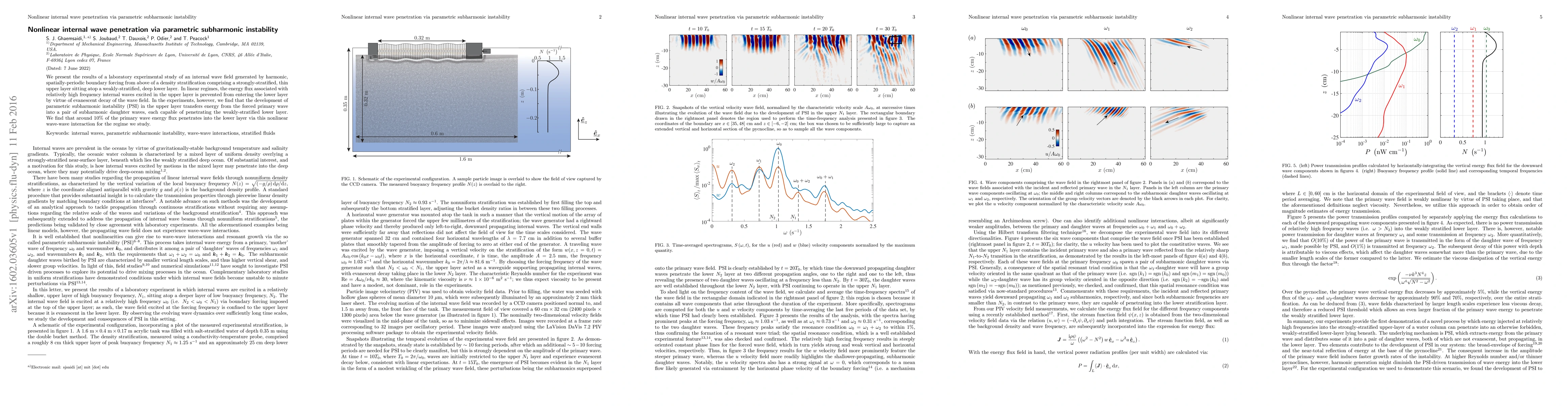 We present the results of a laboratory experimental study of an internal wave field generated by harmonic, spatially-periodic boundary forcing from above of a density stratification comprising a strongly-stratified, thin upper layer sitting atop a weakly-stratified, deep lower layer. In linear regimes, the energy flux associated with relatively high frequency internal waves excited in the upper layer is prevented from entering the lower layer by virtue of evanescent decay of the wave field. In the experiments, however, we find that the development of parametric subharmonic instability (PSI) in the upper layer transfers energy from the forced primary wave into a pair of subharmonic daughter waves, each capable of penetrating the weakly-stratified lower layer. We find that around $10\%$ of the primary wave energy flux penetrates into the lower layer via this nonlinear wave-wave interaction for the regime we study.