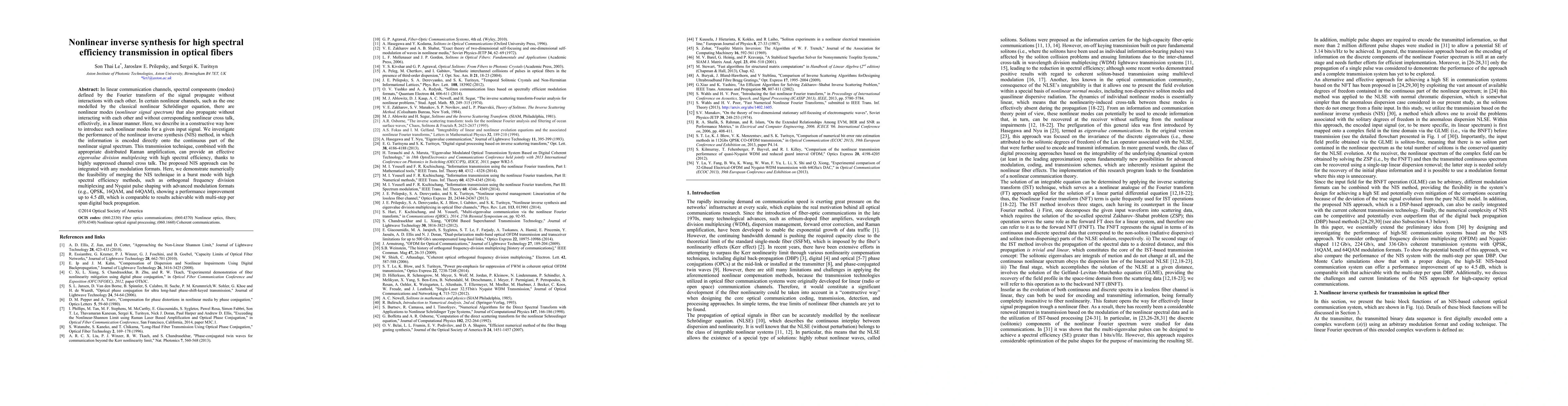 This paper proposes a nonlinear inverse synthesis method for high spectral efficiency transmission in optical fibers, demonstrating its integration with advanced modulation formats and achieving up to 4.5 dB performance improvement through effective eigenvalue division multiplexing and suppressed channel cross talk.