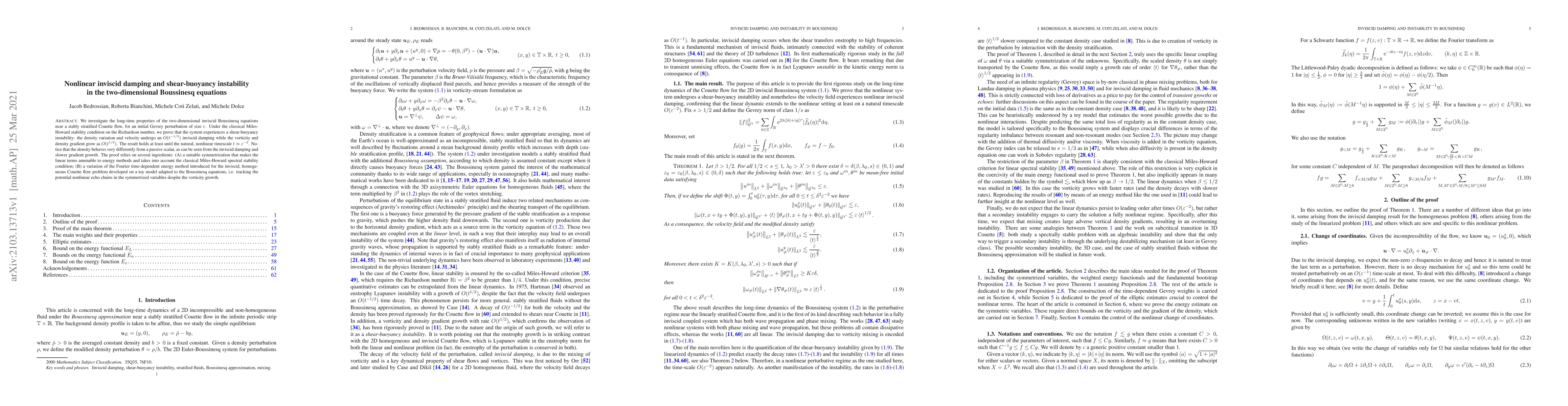 We investigate the long-time properties of the two-dimensional inviscid Boussinesq equations near a stably stratified Couette flow, for an initial Gevrey perturbation of size $\varepsilon$. Under the classical Miles-Howard stability condition on the Richardson number, we prove that the system experiences a shear-buoyancy instability: the density variation and velocity undergo an $O(t^{-1/2})$ inviscid damping while the vorticity and density gradient grow as $O(t^{1/2})$. The result holds at least until the natural, nonlinear timescale $t \approx \varepsilon^{-2}$. Notice that the density behaves very differently from a passive scalar, as can be seen from the inviscid damping and slower gradient growth. The proof relies on several ingredients: (A) a suitable symmetrization that makes the linear terms amenable to energy methods and takes into account the classical Miles-Howard spectral stability condition; (B) a variation of the Fourier time-dependent energy method introduced for the inviscid, homogeneous Couette flow problem developed on a toy model adapted to the Boussinesq equations, i.e. tracking the potential nonlinear echo chains in the symmetrized variables despite the vorticity growth.