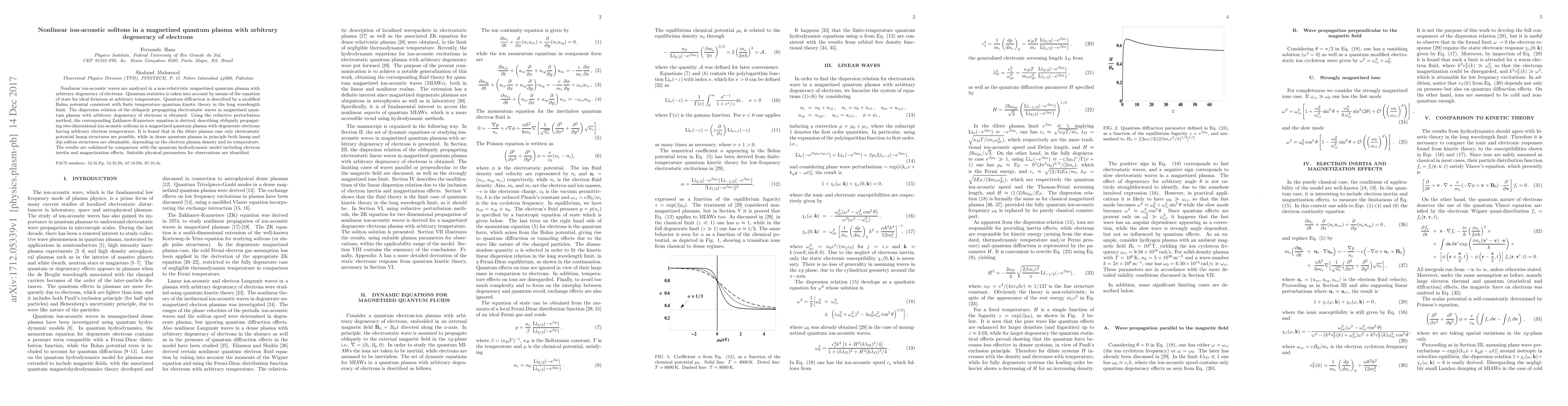 Nonlinear ion-acoustic waves are analyzed in a non-relativistic magnetized quantum plasma with arbitrary degeneracy of electrons. Quantum statistics is taken into account by means of the equation of state for ideal fermions at arbitrary temperature. Quantum diffraction is described by a modified Bohm potential consistent with finite temperature quantum kinetic theory in the long wavelength limit. The dispersion relation of the obliquely propagating electrostatic waves in magnetized quantum plasma with arbitrary degeneracy of electrons is obtained. Using the reductive perturbation method, the corresponding Zakharov-Kuznetsov equation is derived, describing obliquely propagating two-dimensional ion-acoustic solitons in a magnetized quantum plasma with degenerate electrons having arbitrary electron temperature. It is found that in the dilute plasma case only electrostatic potential hump structures are possible, while in dense quantum plasma in principle both hump and dip soliton structures are obtainable, depending on the electron plasma density and its temperature. The results are validated by comparison with the quantum hydrodynamic model including electron inertia and magnetization effects. Suitable physical parameters for observations are identified.