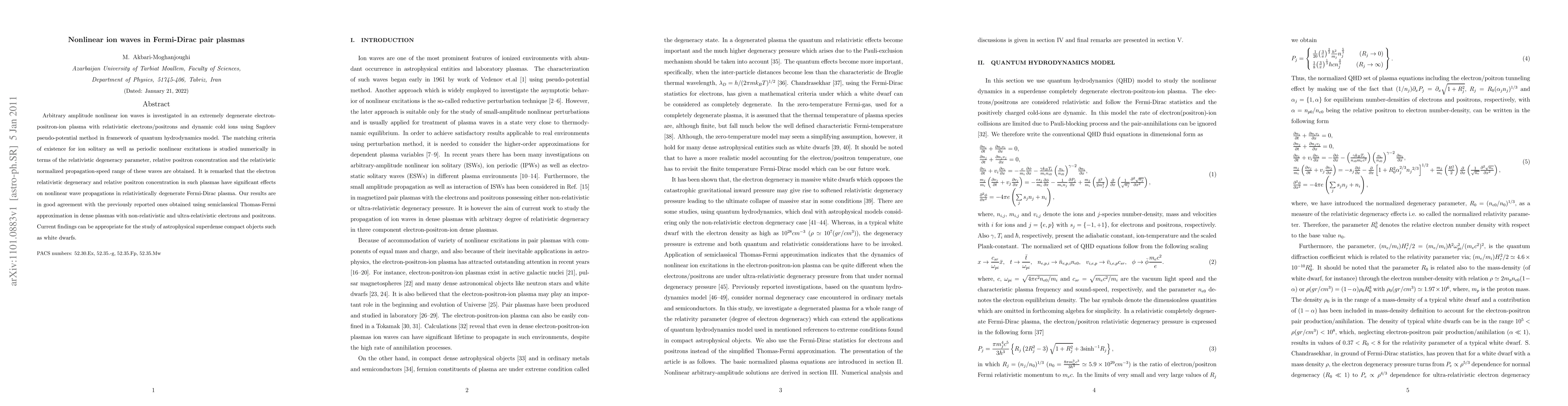 This research investigates nonlinear ion waves in extremely degenerate Fermi-Dirac pair plasmas, employing quantum hydrodynamics and Sagdeev pseudo-potential. It finds that electron relativistic degeneracy and positron concentration significantly influence wave propagation, with results corroborating previous semiclassical models and potentially applicable to astrophysical phenomena like white dwarfs.
