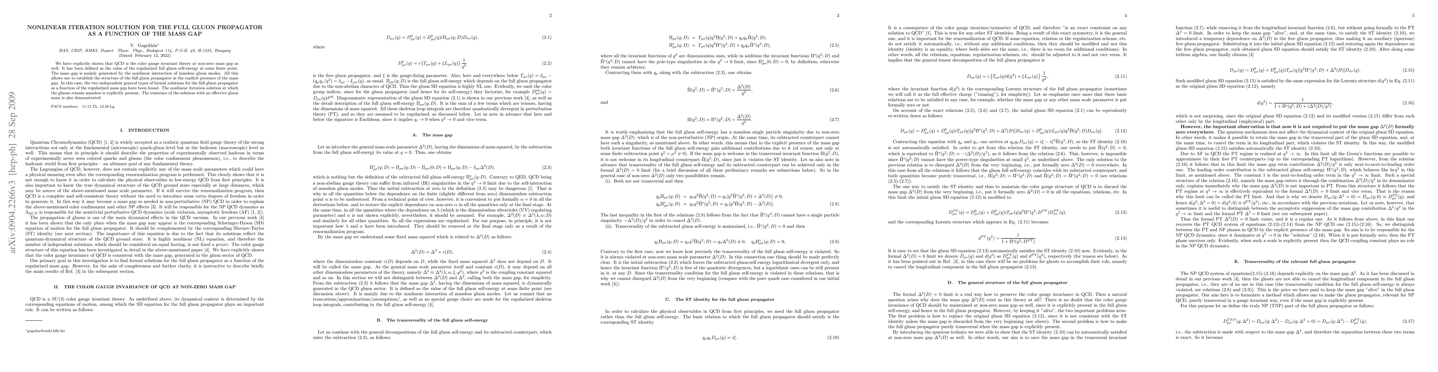 We have explicitly shown that QCD is the color gauge invariant theory at non-zero mass gap as well. It has been defined as the value of the regularized full gluon self-energy at some finite point. The mass gap is mainly generated by the nonlinear interaction of massless gluon modes. All this allows one to establish the structure of the full gluon propagator in the explicit presence of the mass gap. In this case, the two independent general types of formal solutions for the full gluon propagator as a function of the regularized mass gap have been found. The nonlinear iteration solution at which the gluons remain massless is explicitly present. The existence of the solution with an effective gluon mass is also demonstrated.