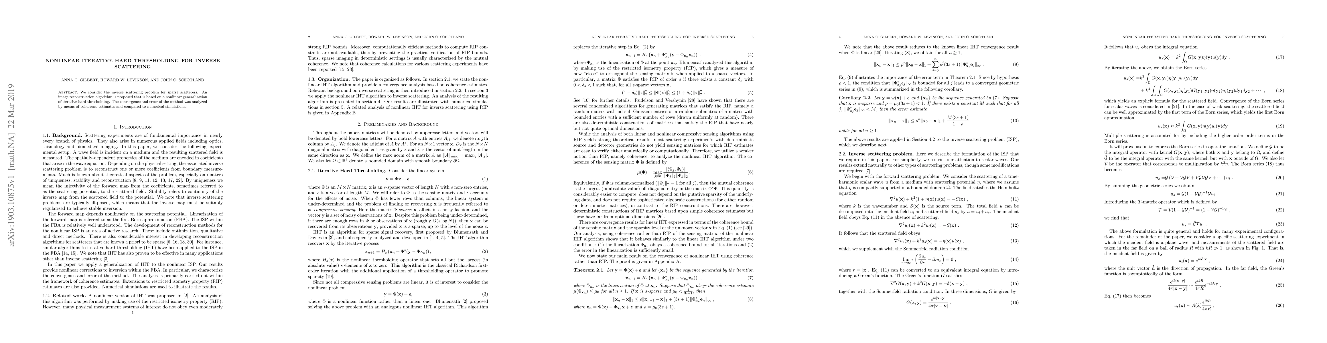 This paper proposes a nonlinear iterative hard thresholding algorithm for reconstructing sparse scatterers in inverse scattering problems. The method's convergence and error are analyzed using coherence estimates and validated through numerical simulations.