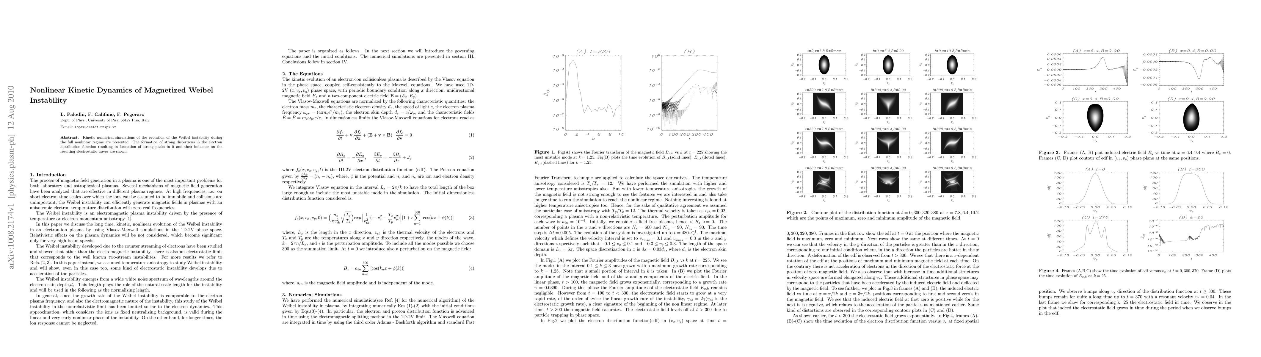 This paper presents kinetic numerical simulations of the Weibel instability in its full nonlinear regime, demonstrating the formation of strong distortions in the electron distribution function and their impact on the resulting electrostatic waves.