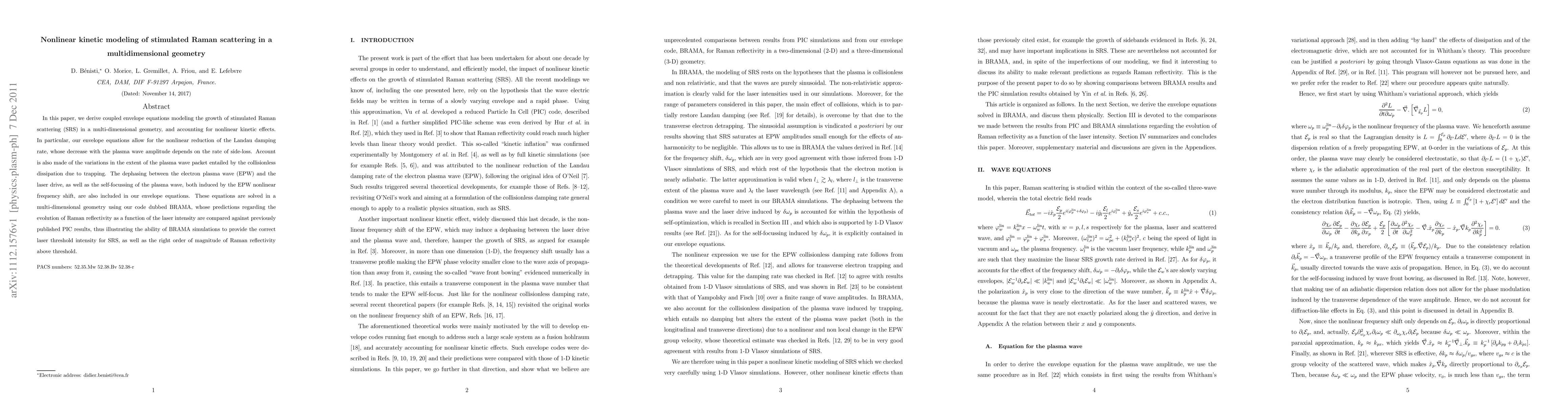 This paper develops coupled envelope equations to model stimulated Raman scattering in multi-dimensional geometry, incorporating nonlinear kinetic effects and the nonlinear reduction of Landau damping. The BRAMA code is used to solve these equations, showing results that match previously published PIC simulations in predicting SRS threshold intensity and Raman reflectivity.