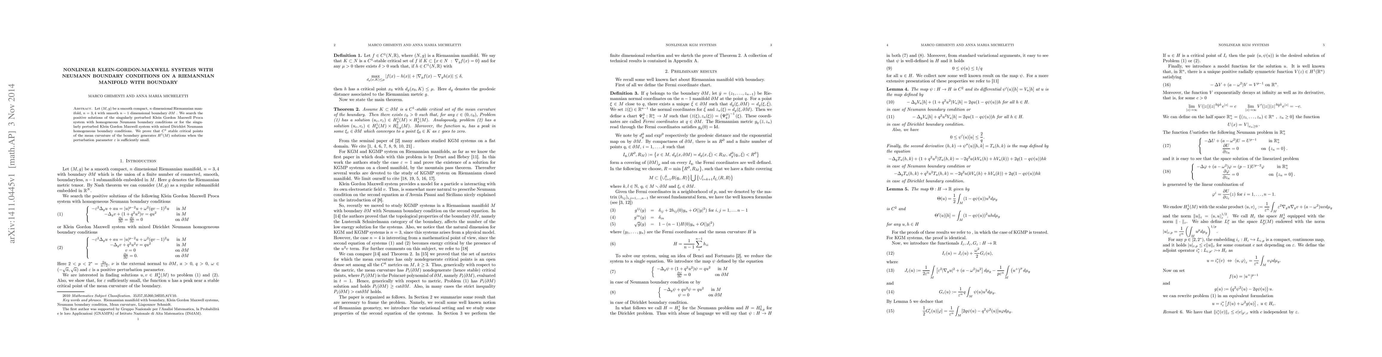 Let (M,g) be a smooth compact, n dimensional Riemannian manifold, n=3,4 with smooth n-1 dimensional boundary. We search the positive solutions of the singularly perturbed Klein Gordon Maxwell Proca system with homogeneous Neumann boundary conditions or for the singularly perturbed Klein Gordon Maxwell system with mixed Dirichlet Neumann homogeneous boundary conditions. We prove that stable critical points of the mean curvature of the boundary generates solutions when the perturbation parameter is sufficiently small.