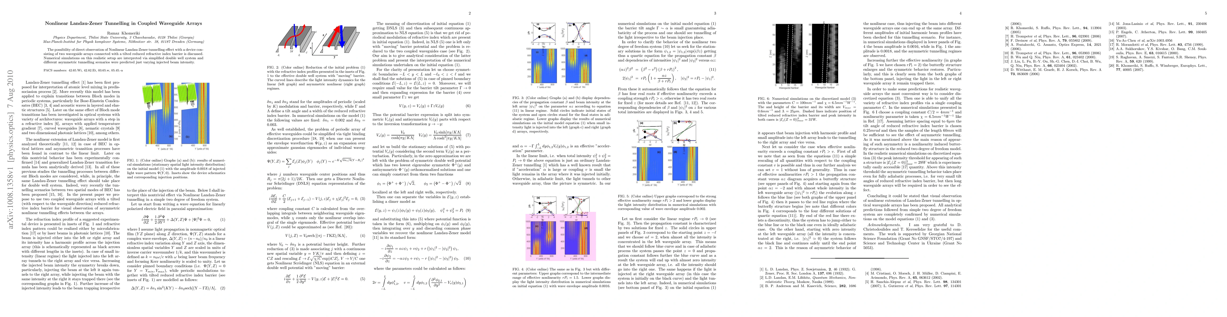 The paper presents analytical considerations and numerical simulations of a coupled waveguide array system, reducing the initial problem to a two-coupled-waveguides case and deriving a nonlinear Landau-Zener model.