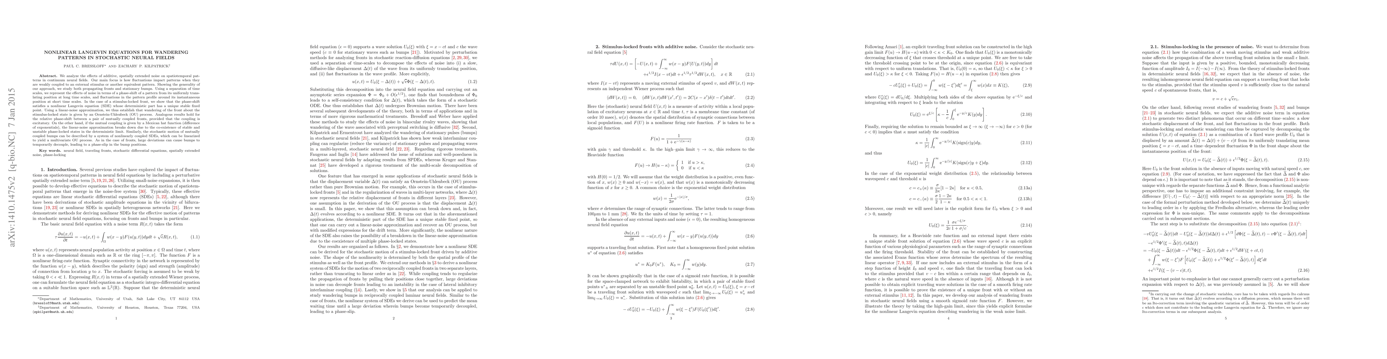 We analyze the effects of additive, spatially extended noise on spatiotemporal patterns in continuum neural fields. Our main focus is how fluctuations impact patterns when they are weakly coupled to an external stimulus or another equivalent pattern. Showing the generality of our approach, we study both propagating fronts and stationary bumps. Using a separation of time scales, we represent the effects of noise in terms of a phase-shift of a pattern from its uniformly translating position at long time scales, and fluctuations in the pattern profile around its instantaneous position at short time scales. In the case of a stimulus-locked front, we show that the phase-shift satisfies a nonlinear Langevin equation (SDE) whose deterministic part has a unique stable fixed point. Using a linear-noise approximation, we thus establish that wandering of the front about the stimulus-locked state is given by an Ornstein-Uhlenbeck (OU) process. Analogous results hold for the relative phase-shift between a pair of mutually coupled fronts, provided that the coupling is excitatory. On the other hand, if the mutual coupling is given by a Mexican hat function (difference of exponentials), then the linear-noise approximation breaks down due to the co-existence of stable and unstable phase-locked states in the deterministic limit. Similarly, the stochastic motion of mutually coupled bumps can be described by a system of nonlinearly coupled SDEs, which can be linearized to yield a multivariate OU process. As in the case of fronts, large deviations can cause bumps to temporarily decouple, leading to a phase-slip in the bump positions.