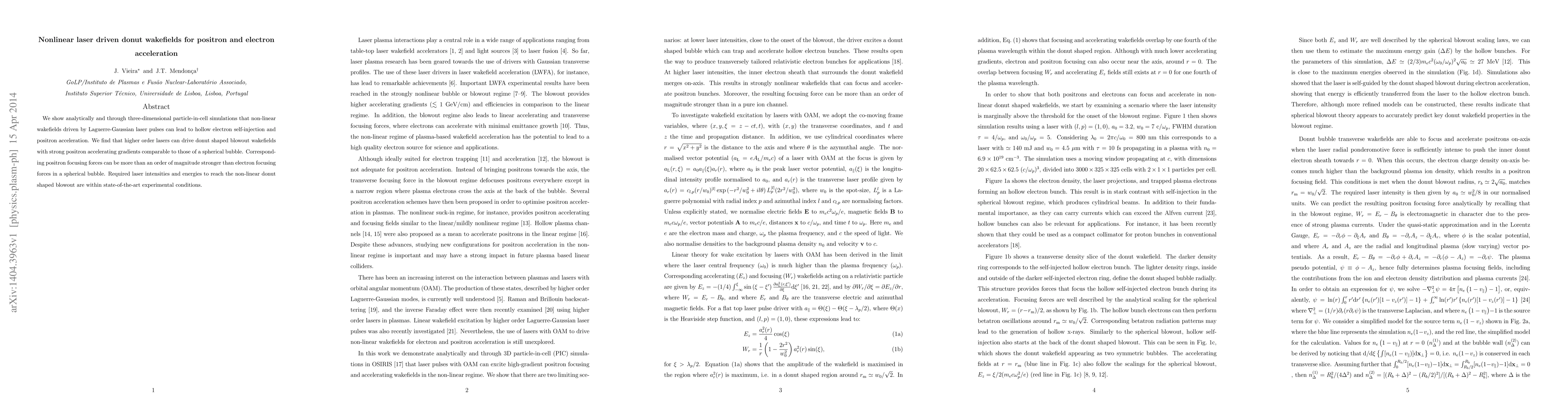 We show analytically and through three-dimensional particle-in-cell simulations that non-linear wakefields driven by Laguerre-Gaussian laser pulses can lead to hollow electron self-injection and positron acceleration. We find that higher order lasers can drive donut shaped blowout wakefields with strong positron accelerating gradients comparable to those of a spherical bubble. Corresponding positron focusing forces can be more than an order of magnitude stronger than electron focusing forces in a spherical bubble. Required laser intensities and energies to reach the non-linear donut shaped blowout are within state-of-the-art experimental conditions.
