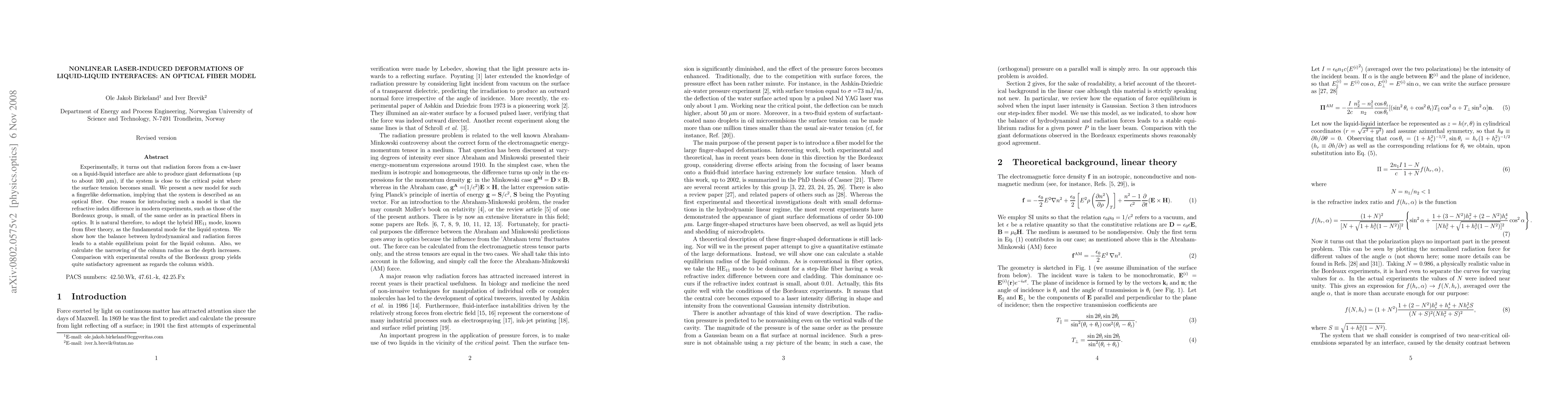 Experimentally, it turns out that radiation forces from a cw-laser on a liquid-liquid interface are able to produce giant deformations (up to about 100\mu m), if the system is close to the critical point where the surface tension becomes small. We present a new model for such a fingerlike deformation, implying that the system is described as an optical fiber. One reason for introducing such a model is that the refractive index difference in modern experiments, such as those of the Bordeaux group, is small, of the same order as in practical fibers in optics. It is natural therefore, to adopt the hybrid HE_{11} mode, known from fiber theory, as the fundamental mode for the liquid system. We show how the balance between hydrodynamical and radiation forces leads to a stable equilibrium point for the liquid column. Also, we calculate the narrowing of the column radius as the depth increases. Comparison with experimental results of the Bordeaux group yields quite satisfactory agreement as regards the column width.