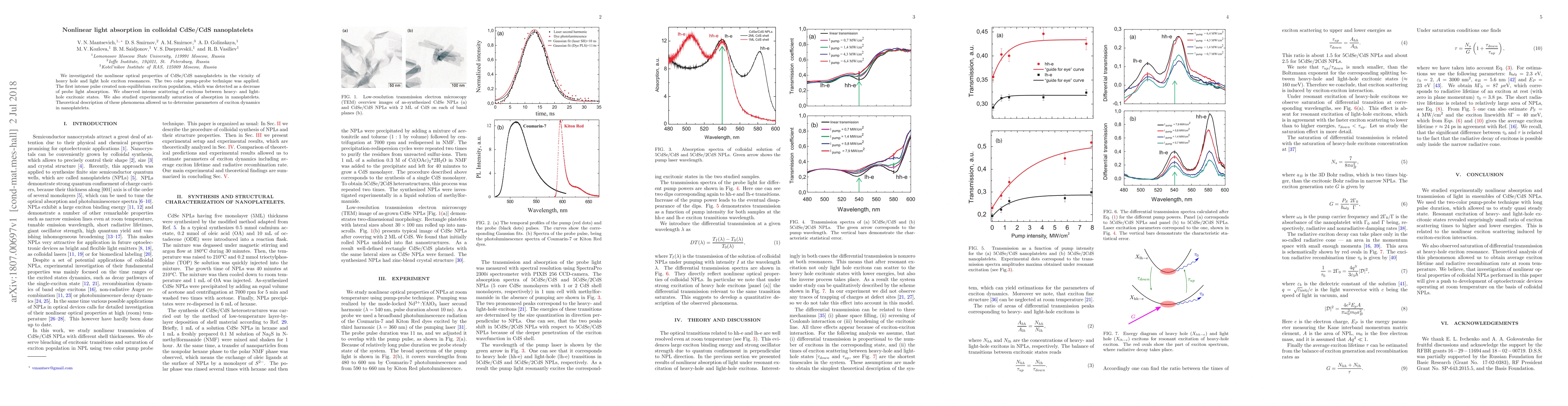 This paper explores the nonlinear optical properties of CdSe/CdS nanoplatelets, revealing intense exciton scattering between heavy and light hole states using a two-color pump-probe technique. The study also demonstrates absorption saturation in nanoplatelets, with theoretical modeling providing insights into exciton dynamics.