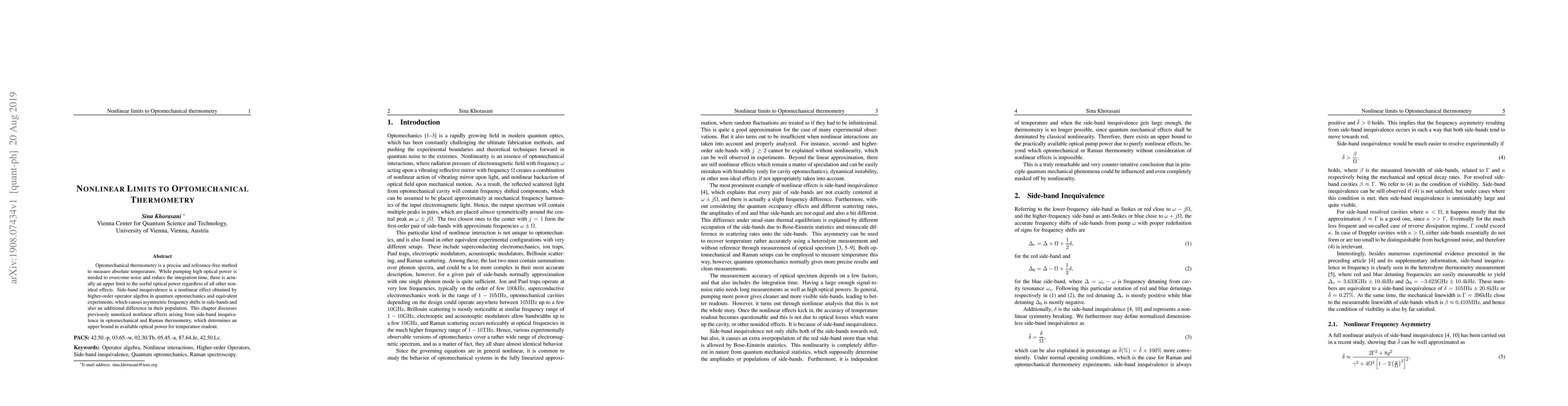 Optomechanical thermometry has an upper limit to useful optical power due to side-band inequivalence, a nonlinear effect that causes asymmetric frequency shifts in side-bands, limiting the precision of temperature measurements.