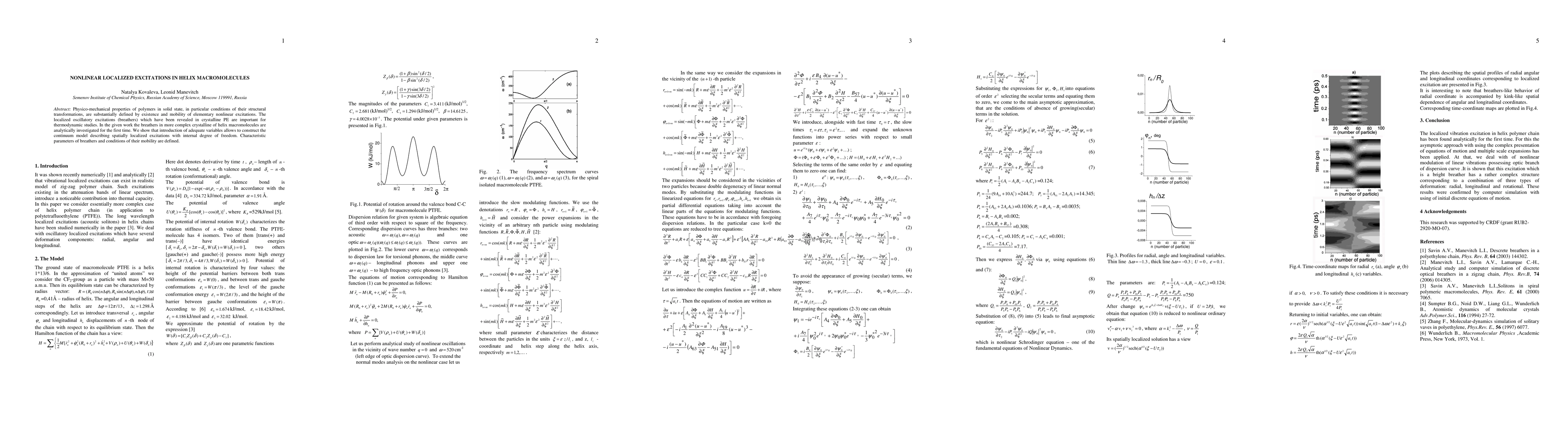 Physico-mechanical properties of polymers in solid state, in particular conditions of their structural transformations, are substantially defined by existence and mobility of elementary nonlinear excitations. The localized oscillatory excitations (breathers) which have been revealed in crystalline PE are important for thermodynamic studies. In the given work the breathers in more complex crystalline of helix macromolecules are analytically investigated for the first time. We show that introduction of adequate variables allows to construct the continuum model describing spatially localized excitations with internal degree of freedom. Characteristic parameters of breathers and conditions of their mobility are defined.