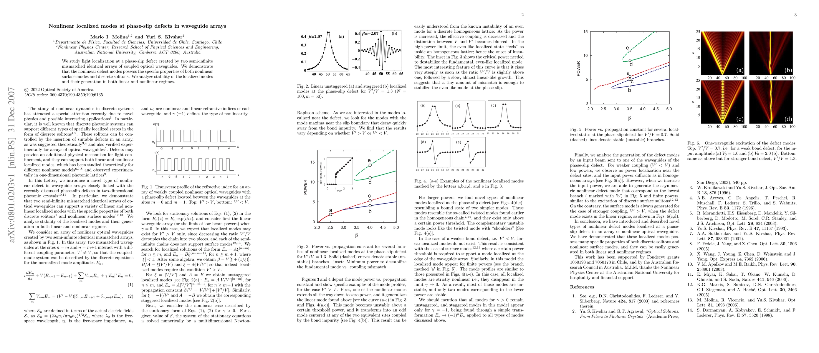 This paper investigates light localization at phase-slip defects in coupled optical waveguide arrays, demonstrating that nonlinear defect modes exhibit characteristics of both nonlinear surface modes and discrete solitons. The study also analyzes the stability and generation of these localized modes in both linear and nonlinear regimes.