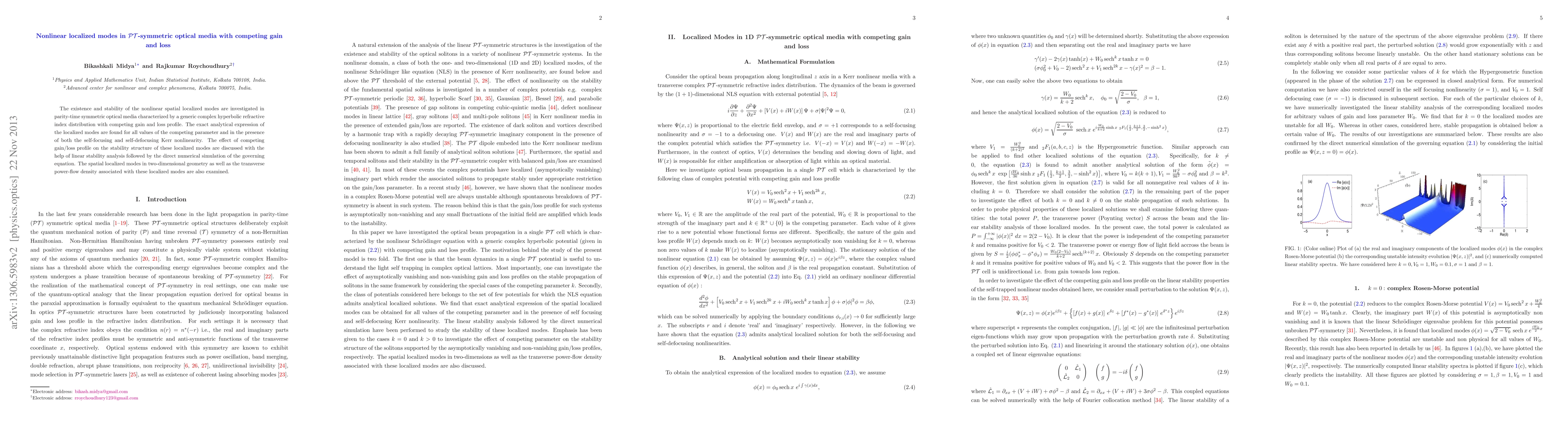 This paper investigates nonlinear localized modes in PT-symmetric optical media with competing gain and loss, deriving exact analytical expressions for the modes and analyzing their stability through linear stability analysis and numerical simulations. The study explores the impact of gain/loss profiles on the stability and examines spatial localized modes in two-dimensional geometry.