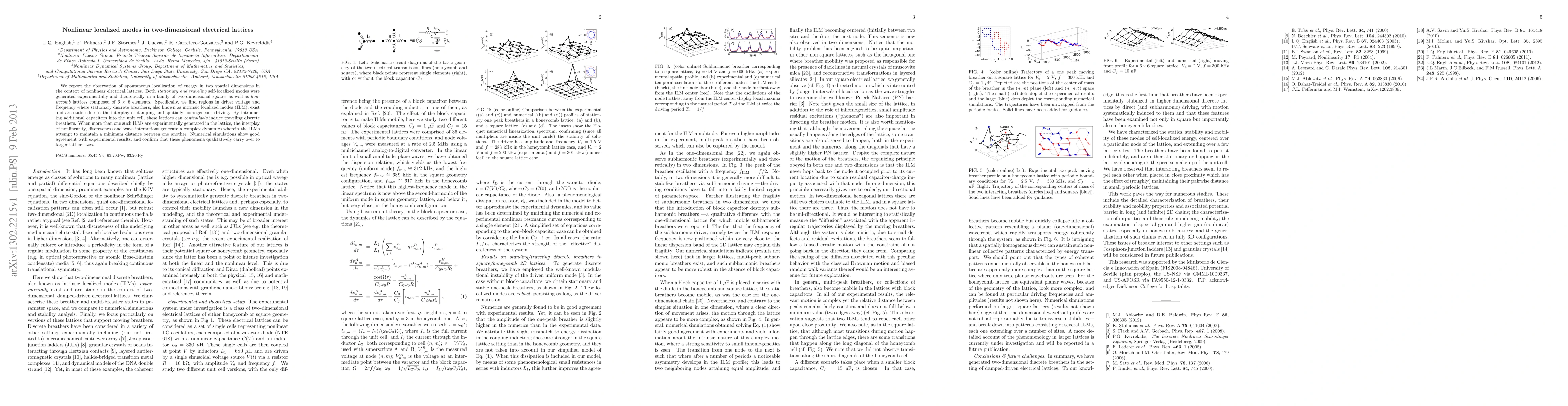 We report the observation of spontaneous localization of energy in two spatial dimensions in the context of nonlinear electrical lattices. Both stationary and traveling self-localized modes were generated experimentally and theoretically in a family of two-dimensional square, as well as hon- eycomb lattices composed of 6x6 elements. Specifically, we find regions in driver voltage and frequency where stationary discrete breathers, also known as intrinsic localized modes (ILM), exist and are stable due to the interplay of damping and spatially homogeneous driving. By introduc- ing additional capacitors into the unit cell, these lattices can controllably induce traveling discrete breathers. When more than one such ILMs are experimentally generated in the lattice, the interplay of nonlinearity, discreteness and wave interactions generate a complex dynamics wherein the ILMs attempt to maintain a minimum distance between one another. Numerical simulations show good agreement with experimental results, and confirm that these phenomena qualitatively carry over to larger lattice sizes.