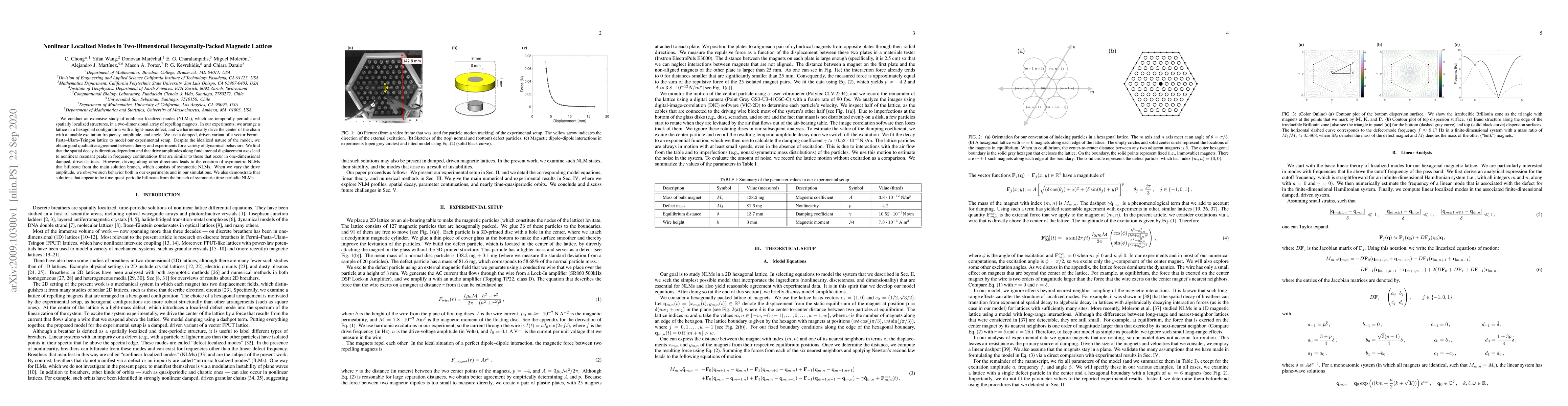 This paper investigates nonlinear localized modes in a two-dimensional hexagonal lattice of repelling magnets, finding direction-dependent spatial decay and asymmetric localized modes that bifurcate from symmetric ones under certain driving conditions. Theoretical modeling aligns well with experimental observations.