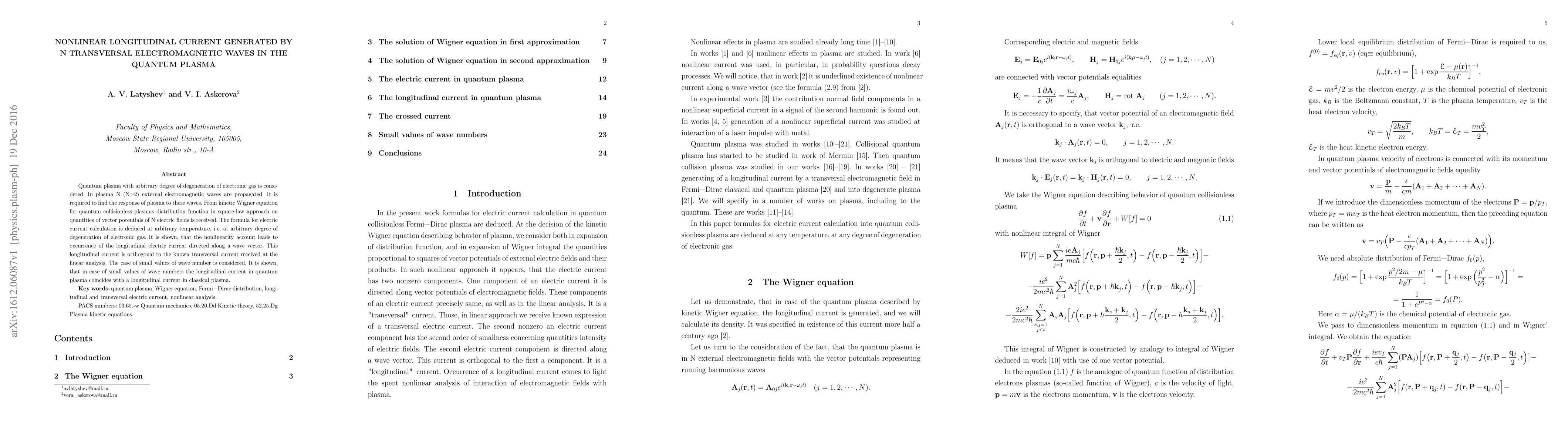 Quantum plasma with arbitrary degree of degeneration of electronic gas is considered. In plasma N (N>2) external electromagnetic waves are propagated. It is required to find the response of plasma to these waves. From kinetic Wigner equation for quantum collisionless plasmas distribution function in square-law approach on quantities of vector potentials of N electric fields is received. The formula for electric current calculation is deduced at arbitrary temperature, i.e. at arbitrary degree of degeneration of electronic gas. It is shown, that the nonlinearity account leads to occurrence of the longitudinal electric current directed along a wave vector. This longitudinal current is orthogonal to the known transversal current received at the linear analysis. The case of small values of wave number is considered. It is shown, that in case of small values of wave numbers the longitudinal current in quantum plasma coincides with a longitudinal current in classical plasma.