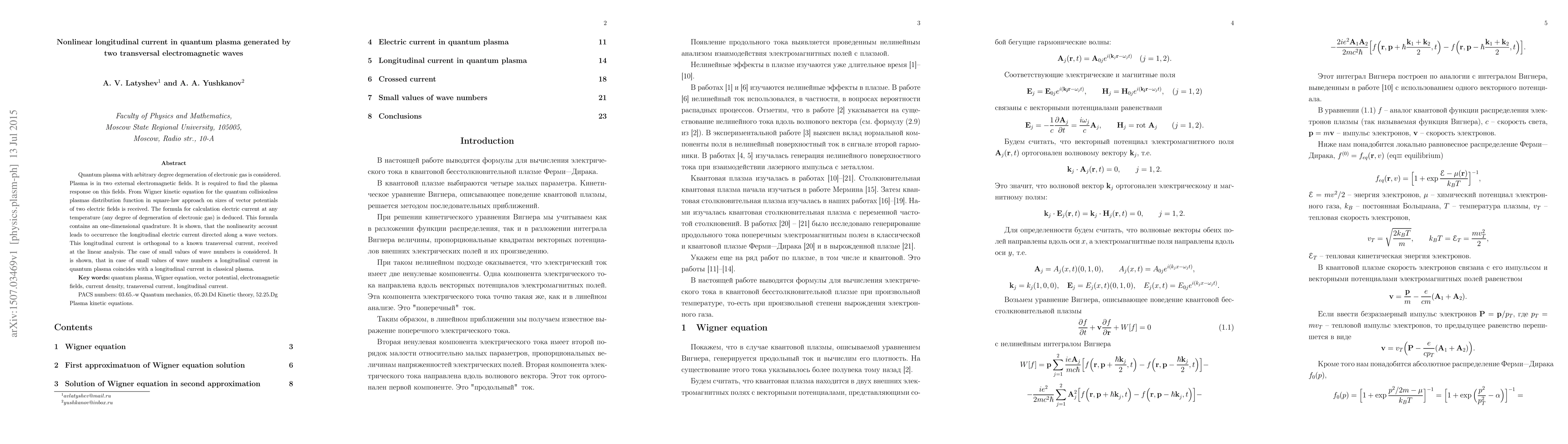 Quantum plasma with arbitrary degree degeneration of electronic gas is considered. Plasma is in two external electromagnetic fields. It is required to find the plasma response on this fields. From Wigner kinetic equation for the quantum collisionless plasmas distribution function in square-law approach on sizes of vector potentials of two electric fields is received. The formula for calculation electric current at any temperature (any degree of degeneration of electronic gas) is deduced. This formula contains an one-dimensional quadrature. It is shown, that the nonlinearity account leads to occurrence the longitudinal electric current directed along a wave vectors. This longitudinal current is orthogonal to a known transversal current, received at the linear analysis. The case of small values of wave numbers is considered. It is shown, that in case of small values of wave numbers a longitudinal current in quantum plasma coincides with a longitudinal current in classical plasma.