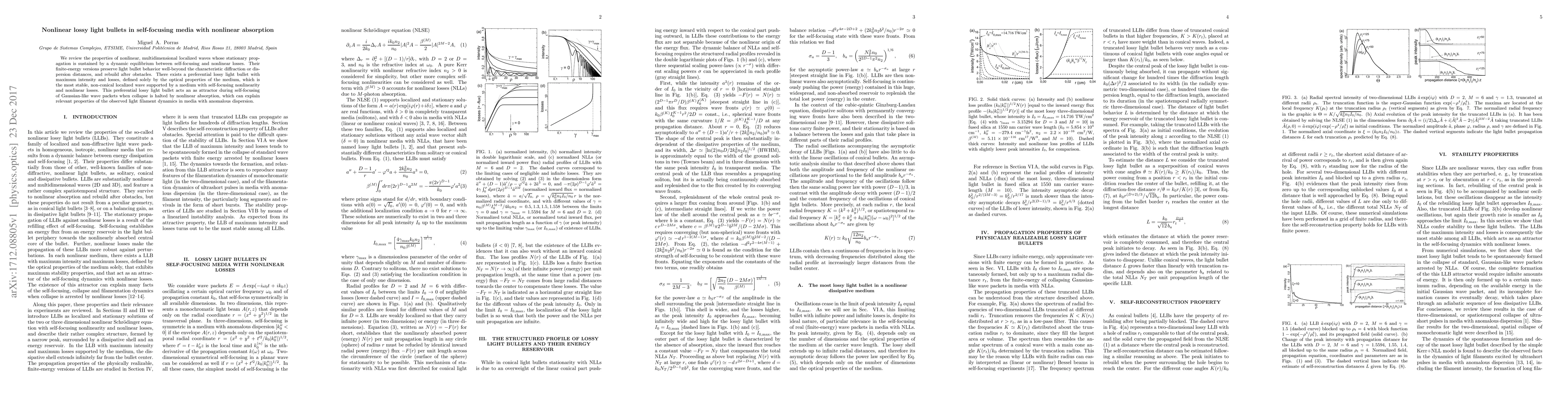 This paper reviews the properties of nonlinear, multidimensional localized waves called lossy light bullets, which maintain stable propagation through self-focusing and nonlinear absorption. The study identifies a preferential lossy light bullet that is the most stable form of these waves, explaining the dynamics of light filaments in media with anomalous dispersion.