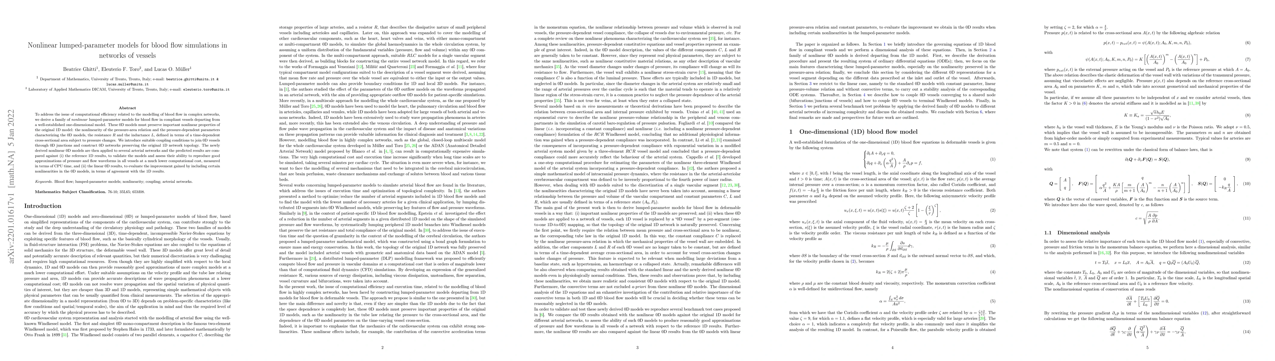 This paper develops nonlinear lumped-parameter models for efficient blood flow simulations in vascular networks, preserving key nonlinear properties from a 1D model. The derived 0D models are validated against both 1D and linear 0D models to demonstrate their computational efficiency and accuracy.