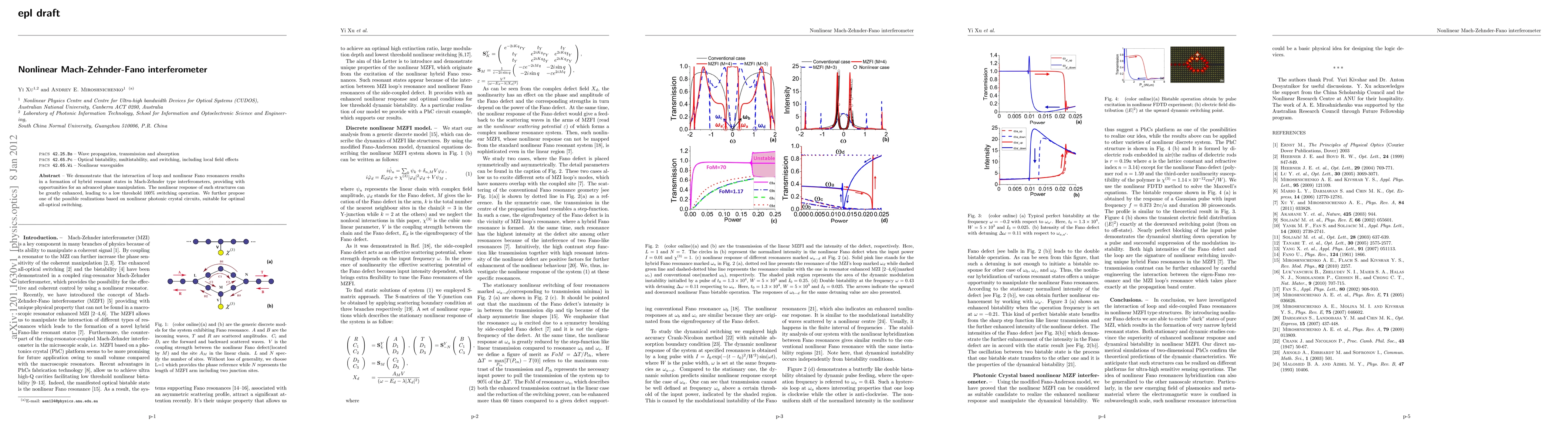 This paper presents a nonlinear Mach-Zehnder-Fano interferometer where loop and nonlinear Fano resonances create hybrid resonant states, enabling advanced phase manipulation and low-threshold 100% switching, with a proposed realization in nonlinear photonic crystal circuits for optimal all-optical switching.