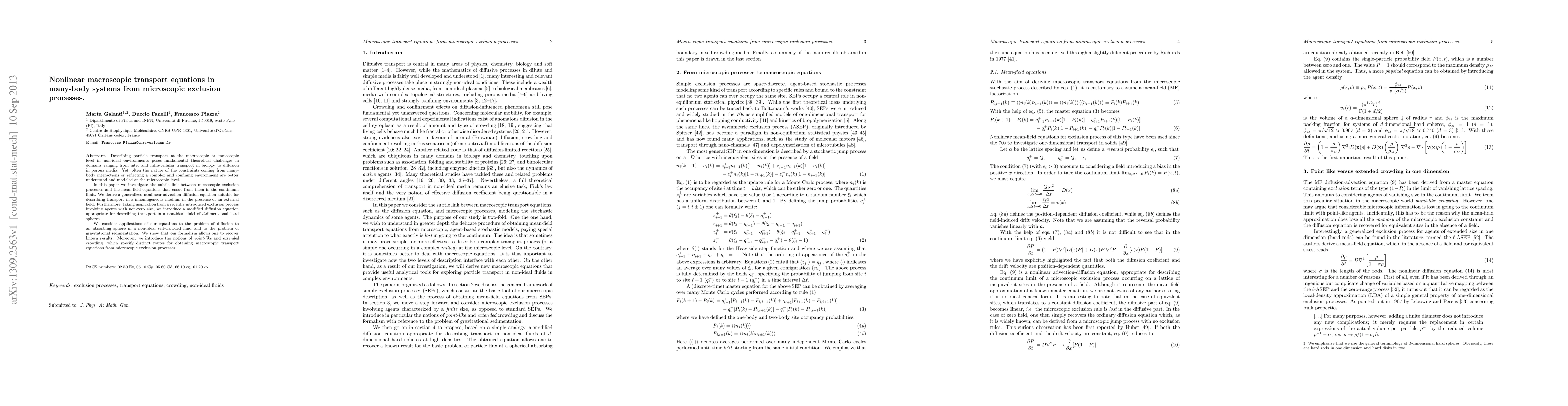 Describing particle transport at the macroscopic or mesoscopic level in non-ideal environments poses fundamental theoretical challenges in domains ranging from inter and intra-cellular transport in biology to diffusion in porous media. Yet, often the nature of the constraints coming from many-body interactions or reflecting a complex and confining environment are better understood and modeled at the microscopic level. In this paper we investigate the subtle link between microscopic exclusion processes and the mean-field equations that ensue from them in the continuum limit. We derive a generalized nonlinear advection diffusion equation suitable for describing transport in a inhomogeneous medium in the presence of an external field. Furthermore, taking inspiration from a recently introduced exclusion process involving agents with non-zero size, we introduce a modified diffusion equation appropriate for describing transport in a non-ideal fluid of $d$-dimensional hard spheres. We consider applications of our equations to the problem of diffusion to an absorbing sphere in a non-ideal self-crowded fluid and to the problem of gravitational sedimentation. We show that our formalism allows one to recover known results. Moreover, we introduce the notions of point-like and extended crowding, which specify distinct routes for obtaining macroscopic transport equations from microscopic exclusion processes.