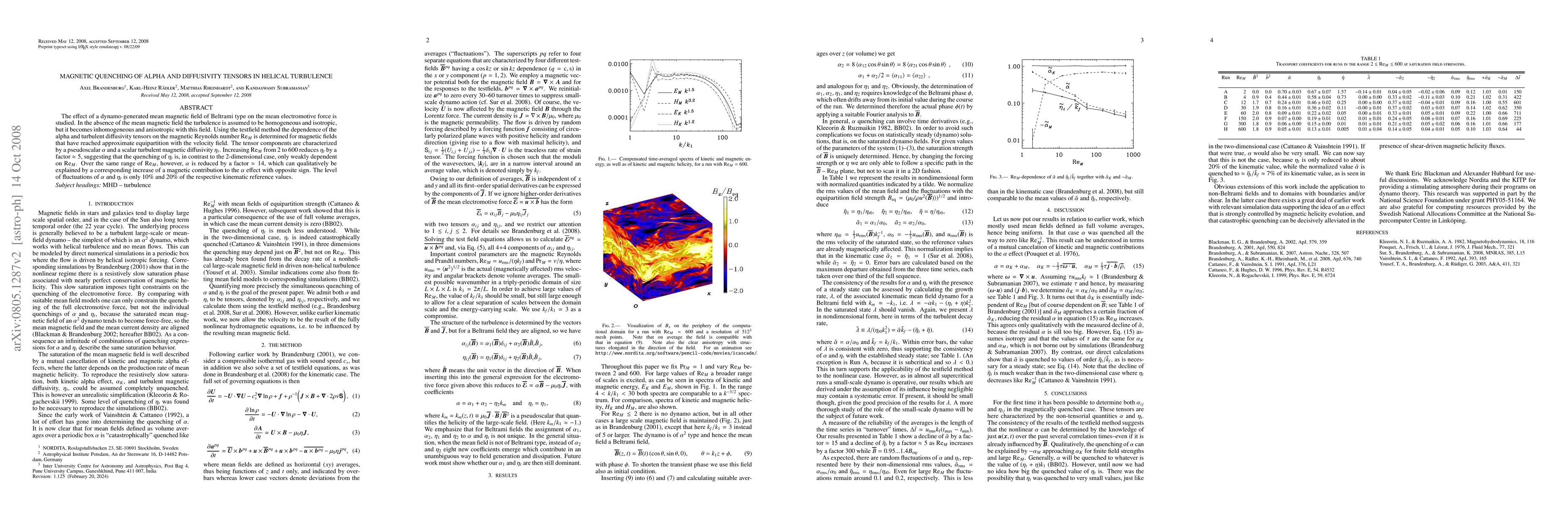The effect of a dynamo-generated mean magnetic field of Beltrami type on the mean electromotive force is studied. In the absence of the mean magnetic field the turbulence is assumed to be homogeneous and isotropic, but it becomes inhomogeneous and anisotropic with this field. Using the testfield method the dependence of the alpha and turbulent diffusivity tensors on the magnetic Reynolds number Rm is determined for magnetic fields that have reached approximate equipartition with the velocity field. The tensor components are characterized by a pseudoscalar alpha and a scalar turbulent magnetic diffusivity etat. Increasing Rm from 2 to 600 reduces etat by a factor ~5, suggesting that the quenching of etat is, in contrast to the 2-dimensional case, only weakly dependent on Rm. Over the same range of Rm, however, alpha is reduced by a factor ~14, which can qualitatively be explained by a corresponding increase of a magnetic contribution to the alpha effect with opposite sign. The level of fluctuations of alpha and etat is only 10% and 20% of the respective kinematic reference values.