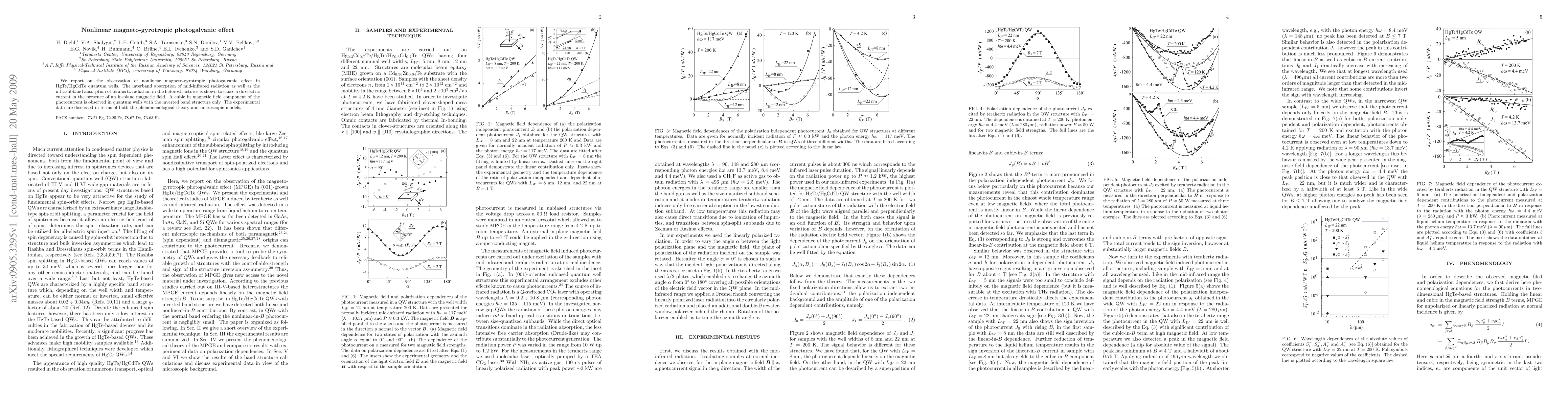 This paper reports on the discovery of a nonlinear magneto-gyrotropic photogalvanic effect in HgTe/HgCdTe quantum wells, demonstrating a dc electric current induced by mid-infrared and terahertz radiation in the presence of an in-plane magnetic field, with a cubic dependence on the magnetic field observed in quantum wells with inverted band structures. The findings are analyzed using both phenomenological theory and microscopic models.