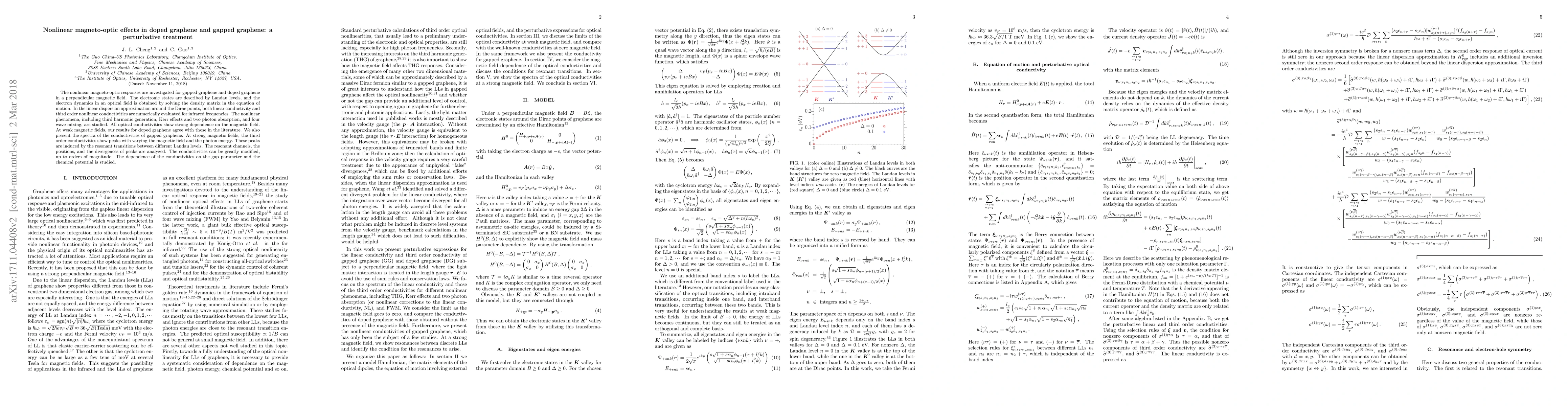 The paper presents a detailed perturbative analysis of linear and third-order conductivities in doped and gapped graphene under magnetic fields, providing a solid theoretical foundation for understanding nonlinear magneto-optic effects in these systems.
