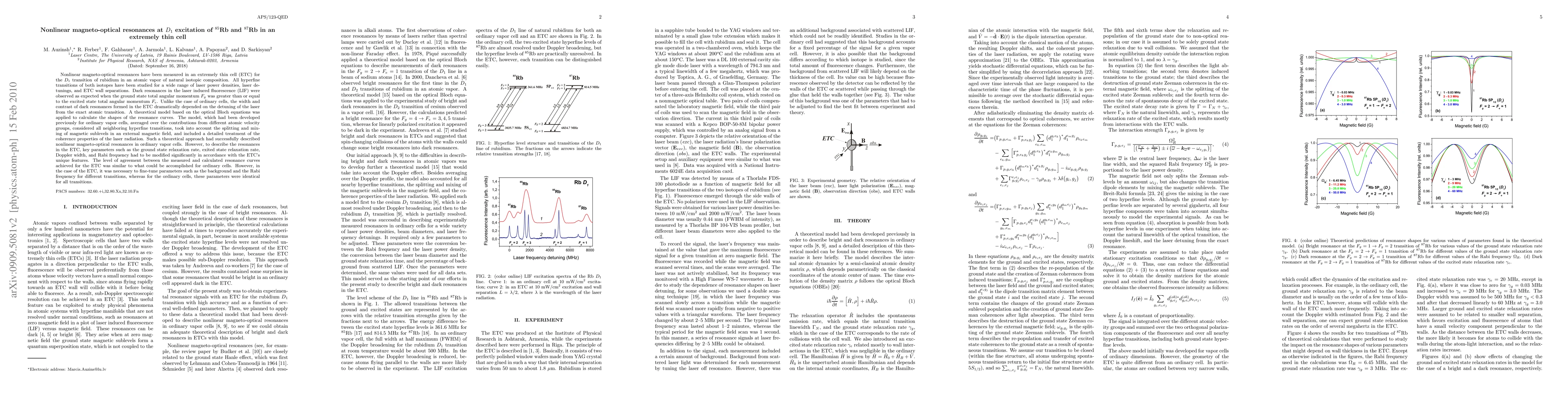 This study investigates nonlinear magneto-optical resonances in an extremely thin cell for rubidium's D1 transition, observing dark resonances dependent on laser detuning. A theoretical model based on optical Bloch equations successfully describes these resonances, though parameters like transit relaxation rate differ from those in ordinary cells.