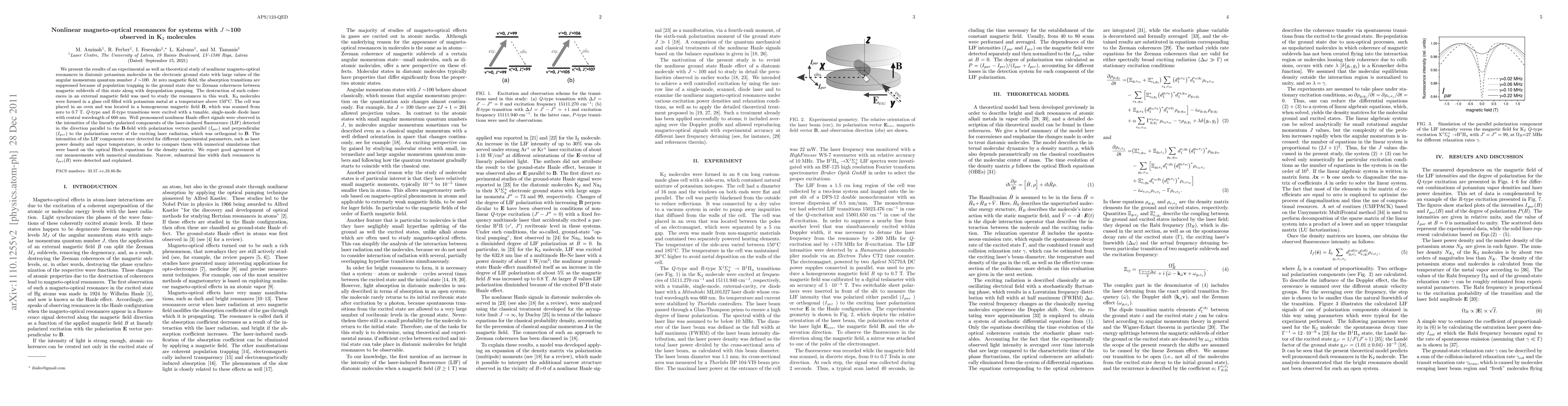 We present the results of an experimental as well as theoretical study of nonlinear magneto-optical resonances in diatomic potassium molecules in the electronic ground state with large values of the angular momentum quantum number J~100. At zero magnetic field, the absorption transitions are suppressed because of population trapping in the ground state due to Zeeman coherences between magnetic sublevels of this state along with depopulation pumping. The destruction of such coherences in an external magnetic field was used to study the resonances in this work. K2 molecules were formed in a glass cell filled with potassium metal at a temperature above 150C. The cell was placed in an oven and was located in a homogeneous magnetic field B, which was scanned from zero to 0.7 T. Q-type and R-type transitions were excited with a tunable, single-mode diode laser with central wavelength of 660 nm. Well pronounced nonlinear Hanle effect signals were observed in the intensities of the linearly polarized components of the laser-induced fluorescence (LIF) detected in the direction parallel to the (B)-field with polarization vectors parallel (I_par) and perpendicular (I_per) to the polarization vector of the exciting laser radiation, which was orthogonal to (B). The intensities of the LIF components were detected for different experimental parameters, such as laser power density and vapor temperature, in order to compare them with numerical simulations that were based on the optical Bloch equations for the density matrix. We report good agreement of our measurements with numerical simulations. Narrow, subnatural line width dark resonances in I_per(B) were detected and explained.